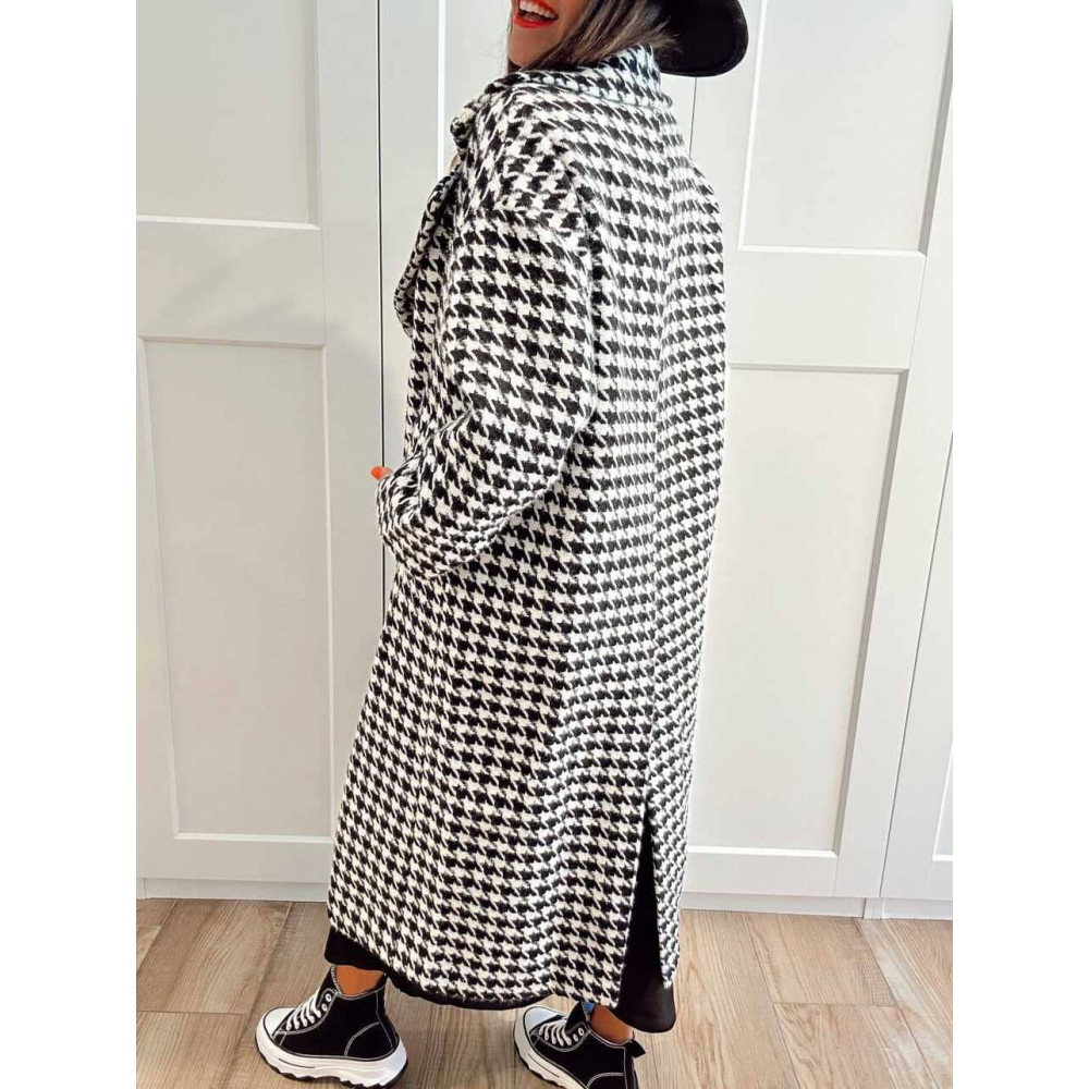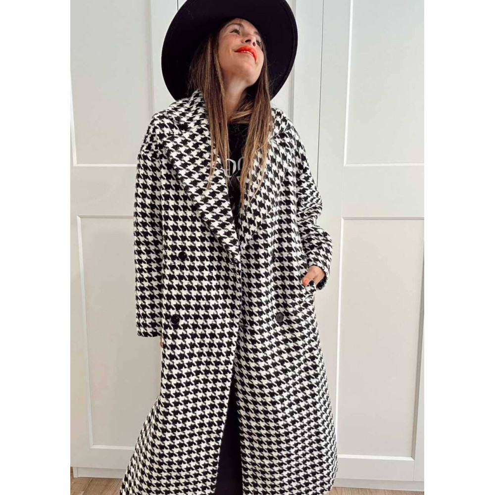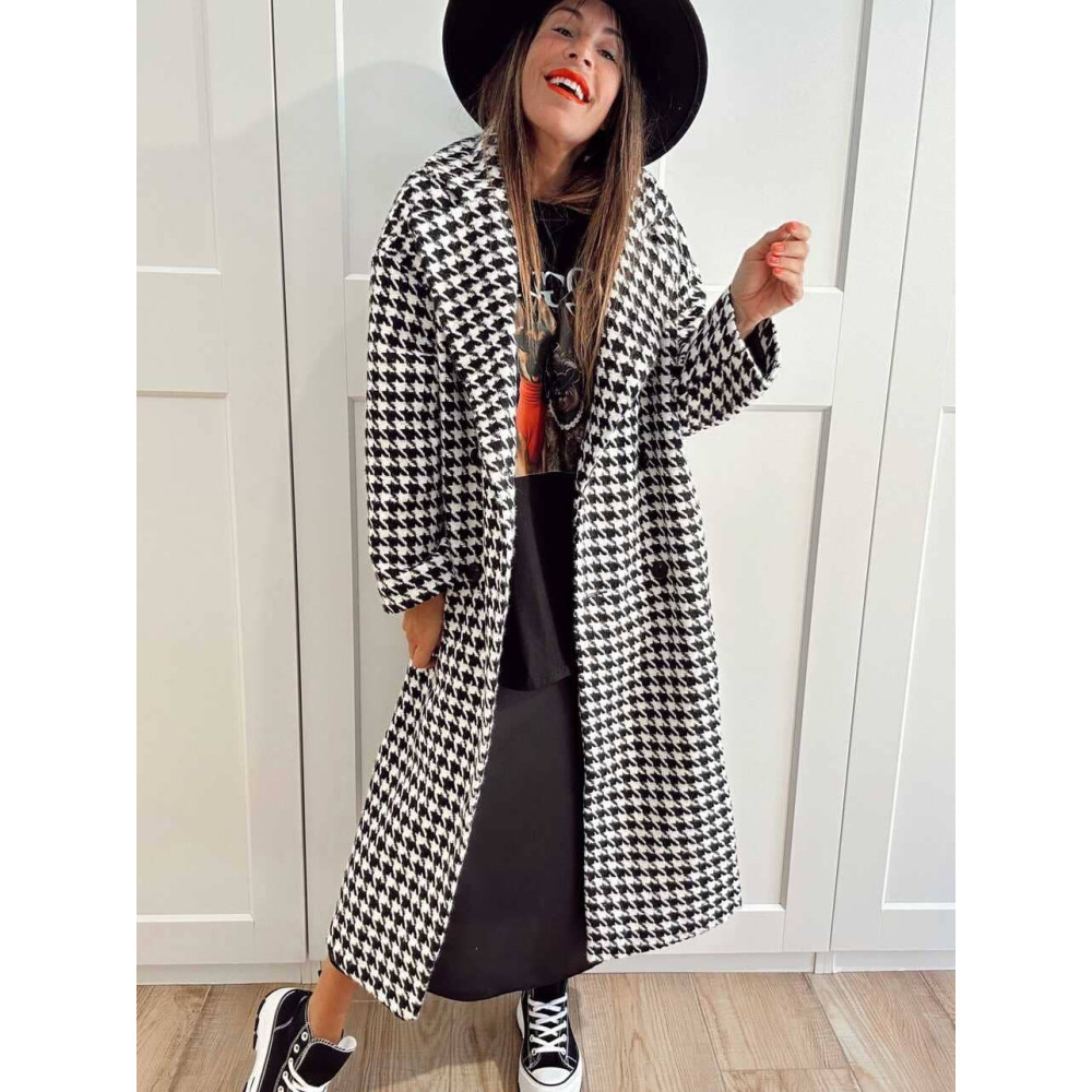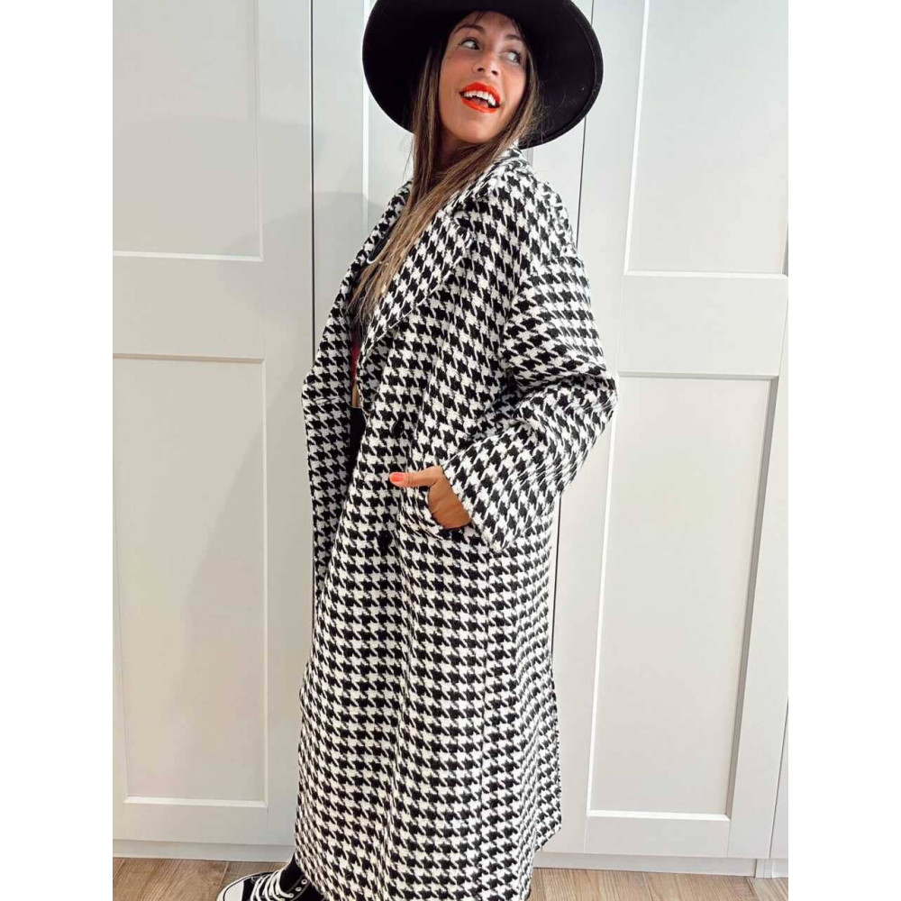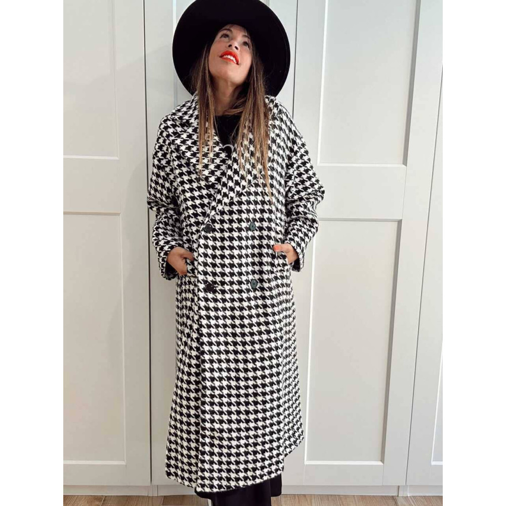 - Abrigo largo de mujer con estampado pata de gallo en combinación blanco/negro.