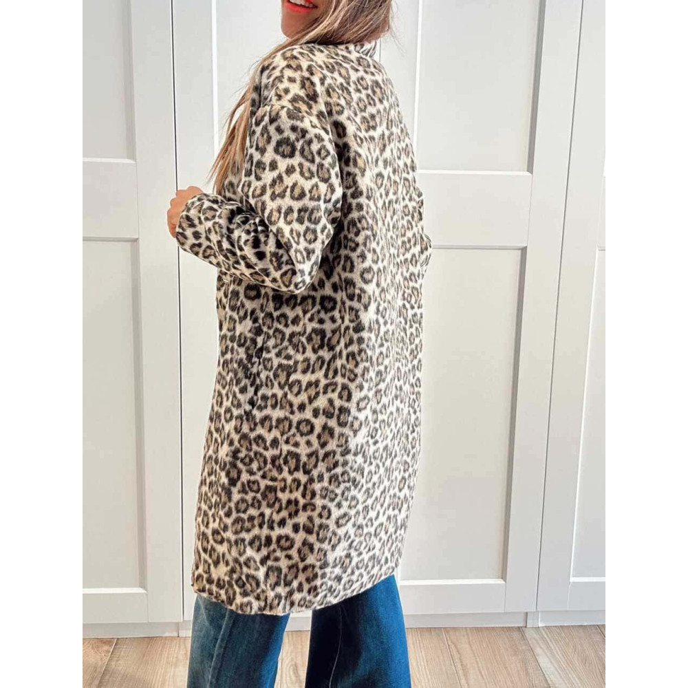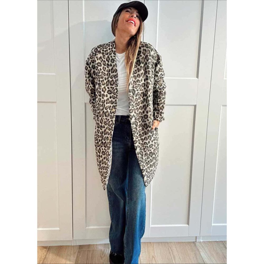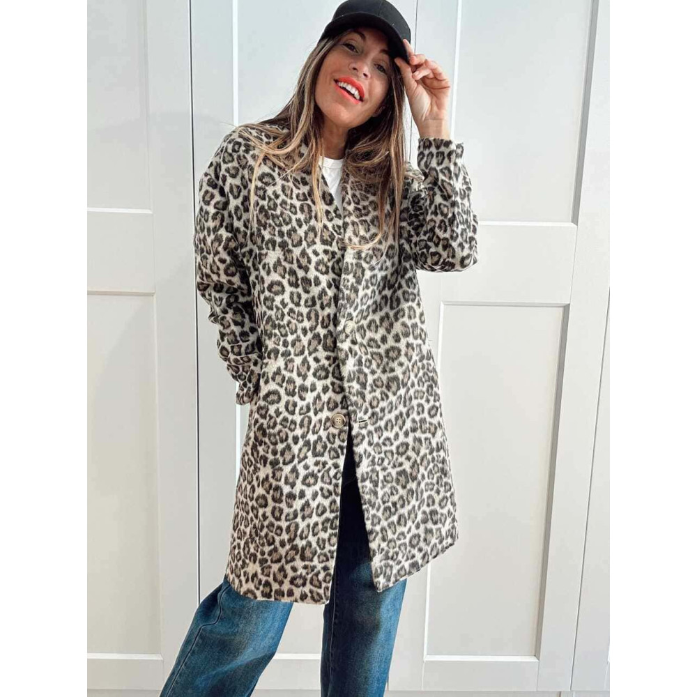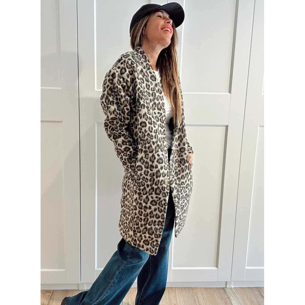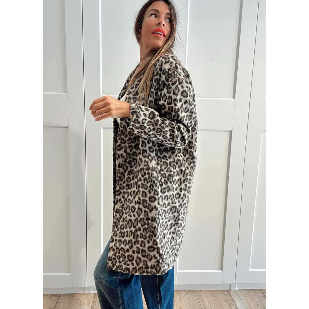 • Abrigo de mujer de tacto suave con estampado animal print en tonos beige, marrón y negro.