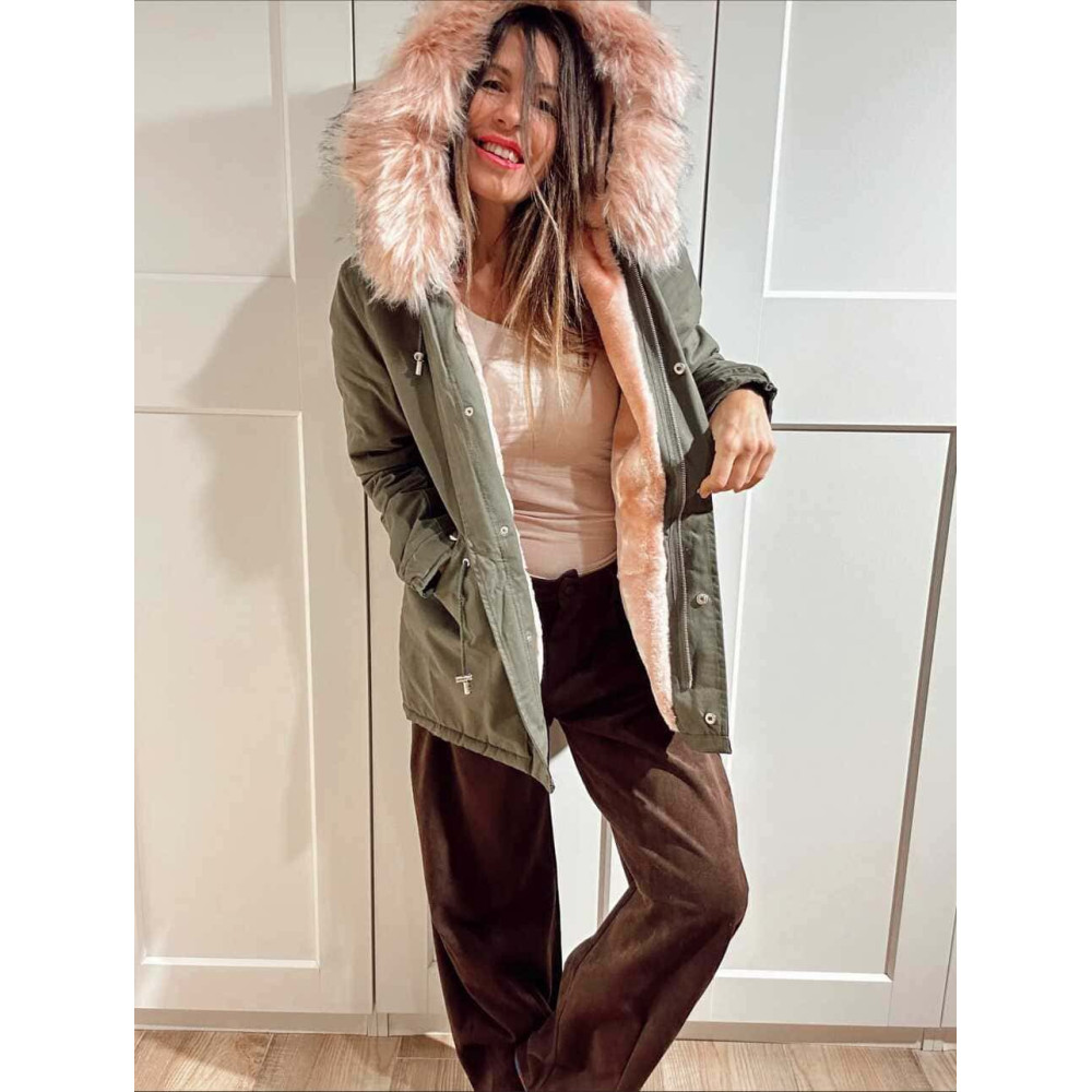- Capucha fija con aplique efecto pelo desmontable mediante botones invisibles.