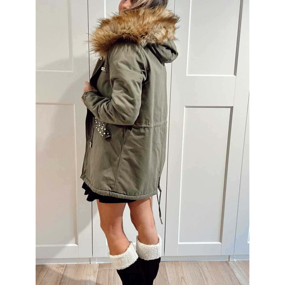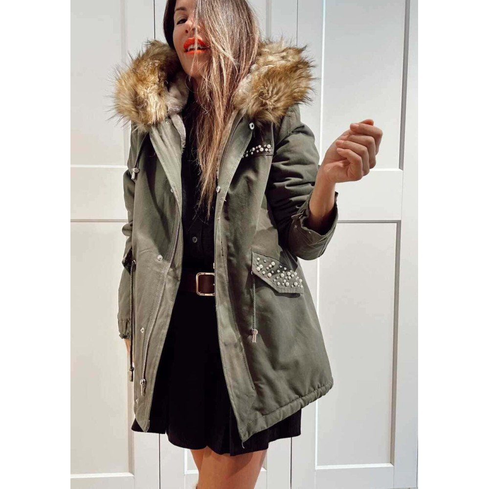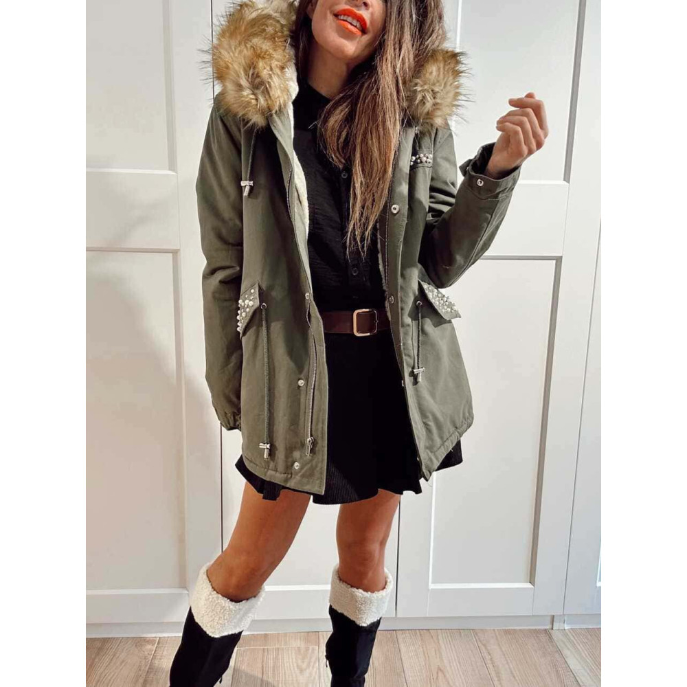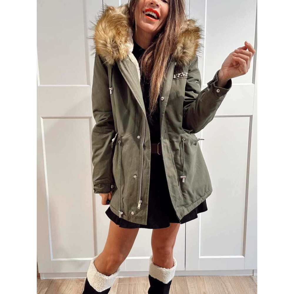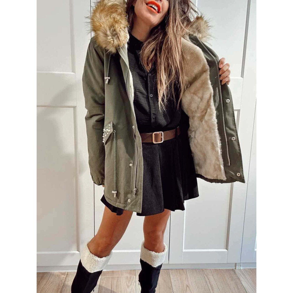 - Capucha fija con aplique efecto pelo desmontable mediante botones invisibles.