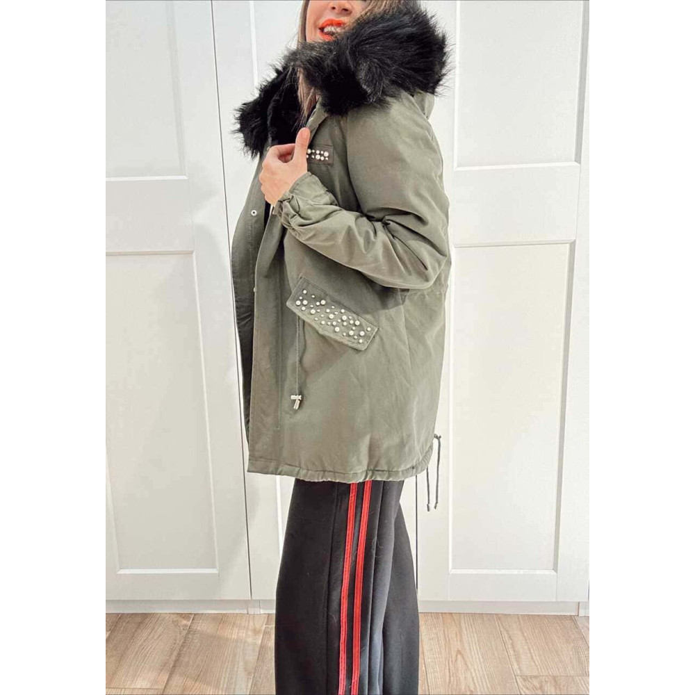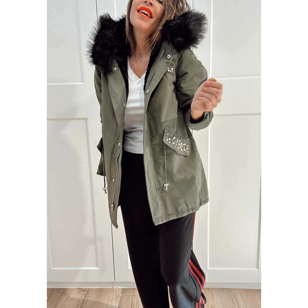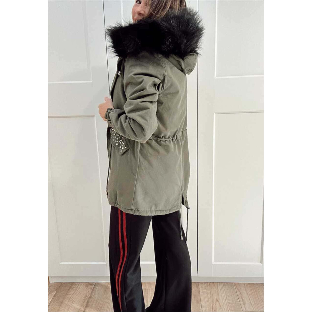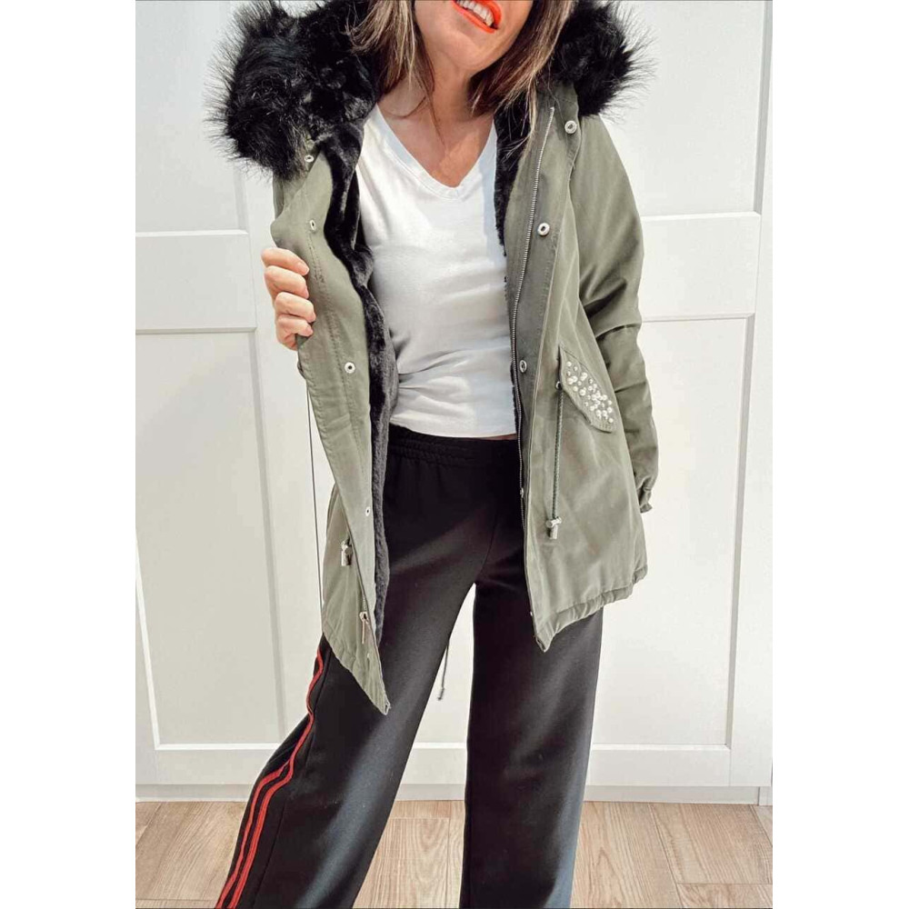 - Capucha fija con aplique efecto pelo desmontable mediante botones invisibles.