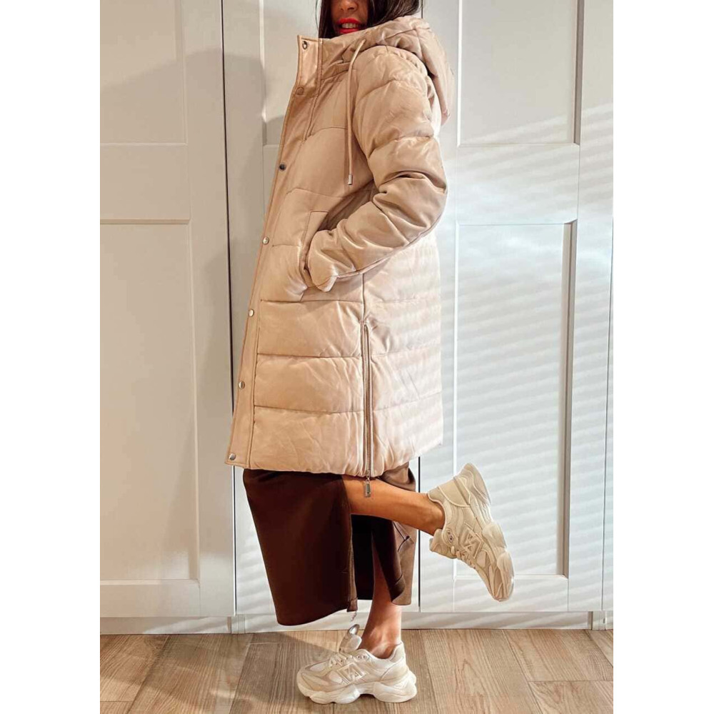 - Abrigo acolchado confeccionado en piel sintética con costuras horizontales.