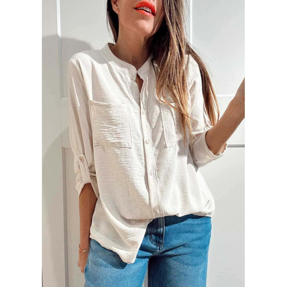 - Camisa de manga larga con cuello Mao y bajo asimétrico.