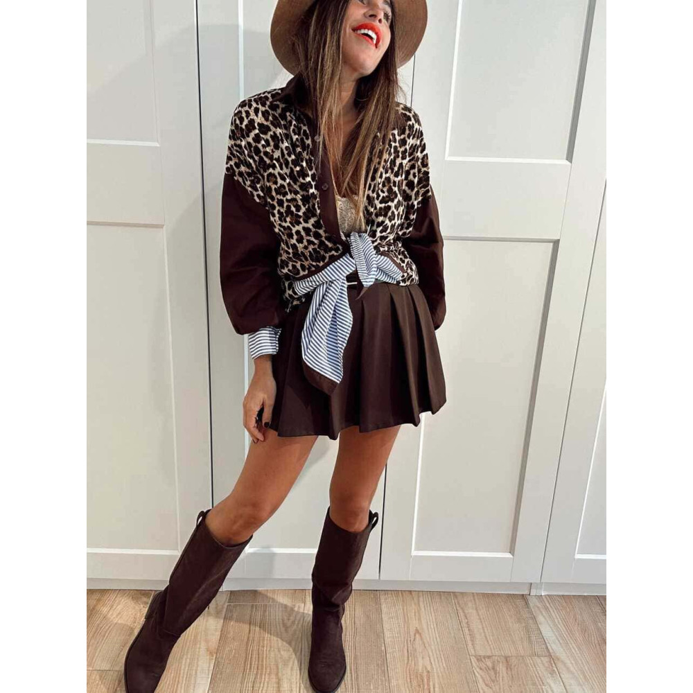 - Diseño con cuello, mangas y botonadura en color marrón sólido.