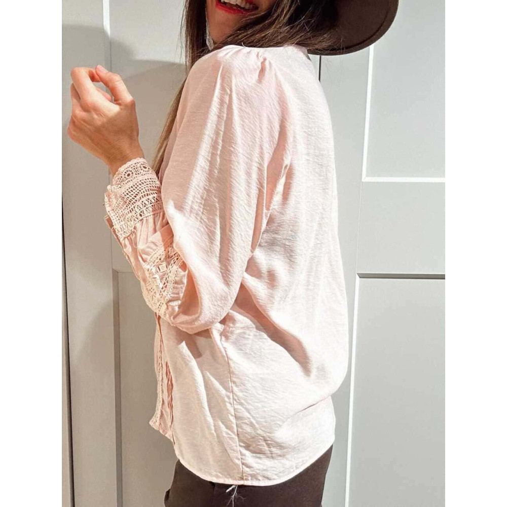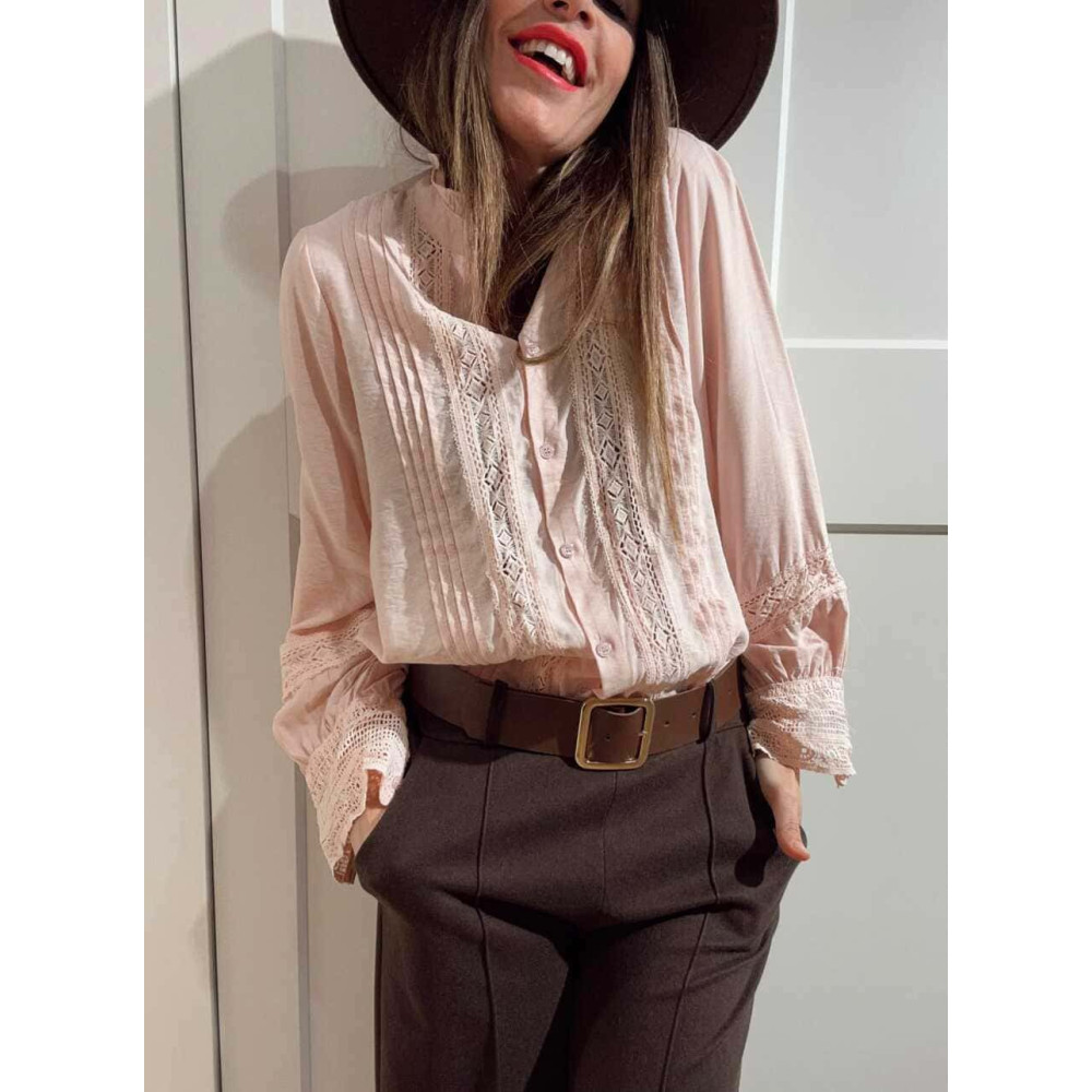- Blusa de estilo romántico con cuello ruffle y jaretas.