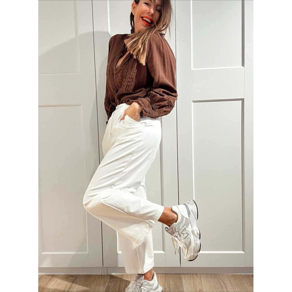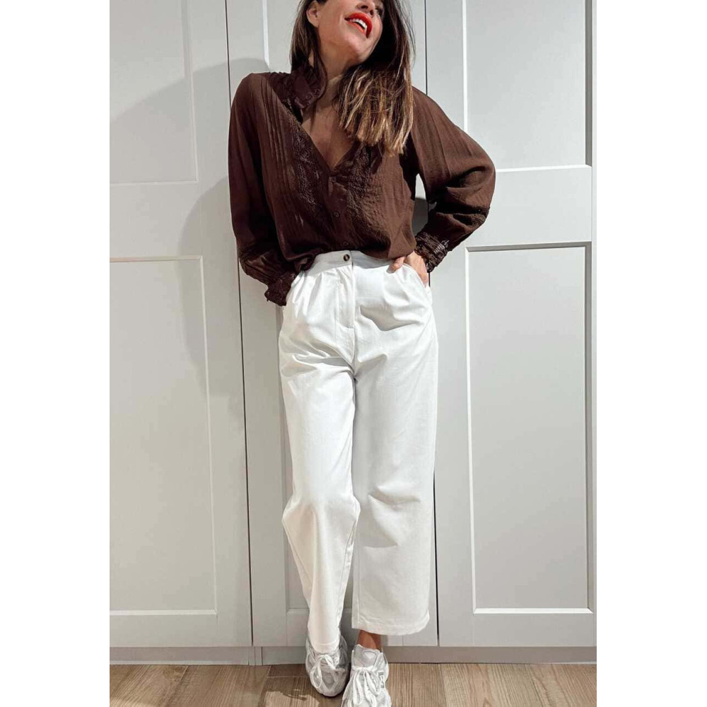 - Blusa de estilo romántico con cuello ruffle y jaretas.