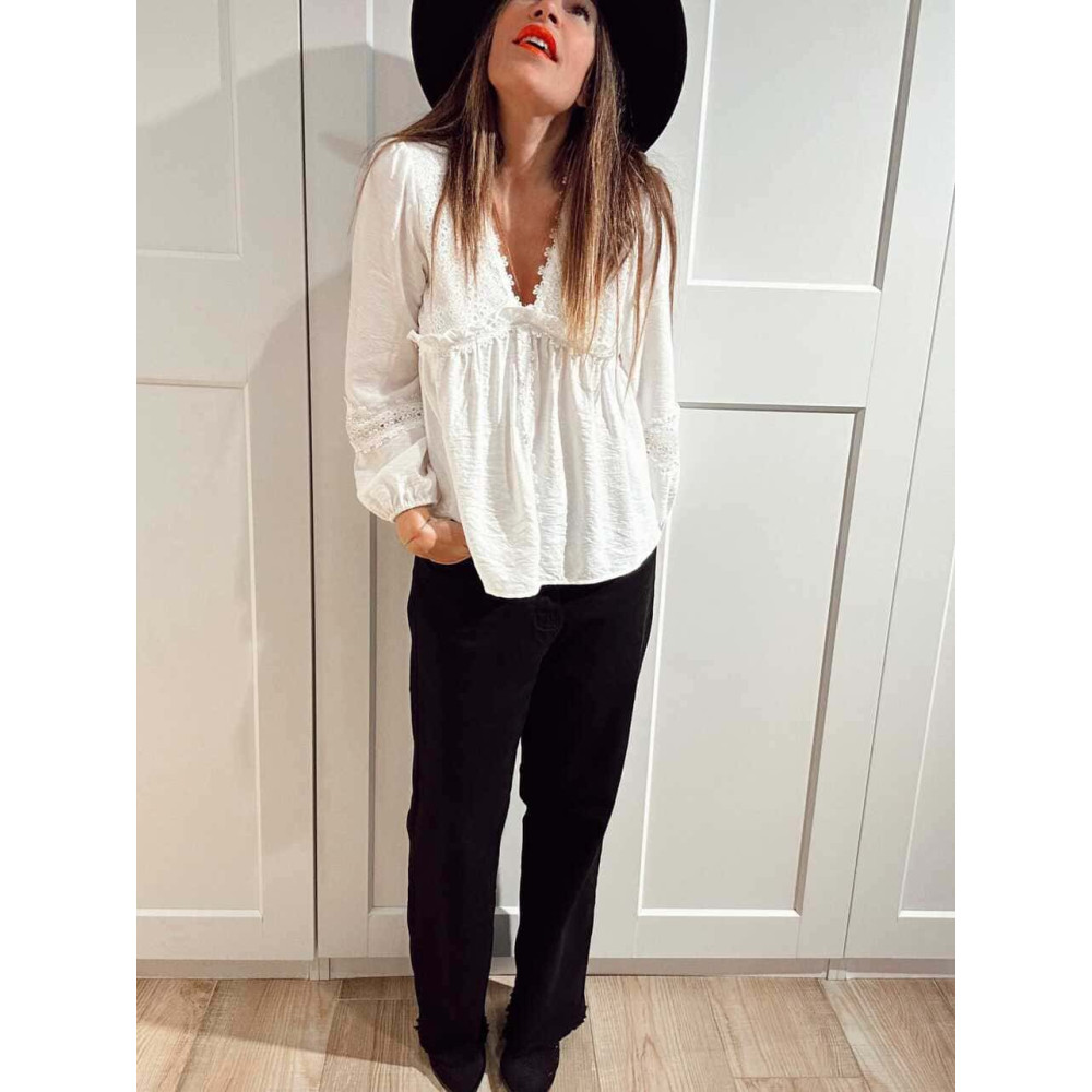 - Blusa de estilo romántico con apliques bordado-perforado y terminaciones festoneadas.