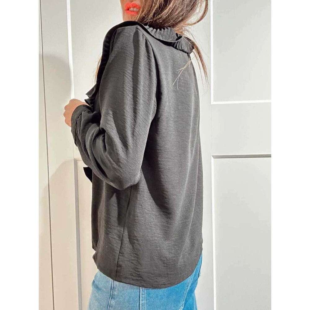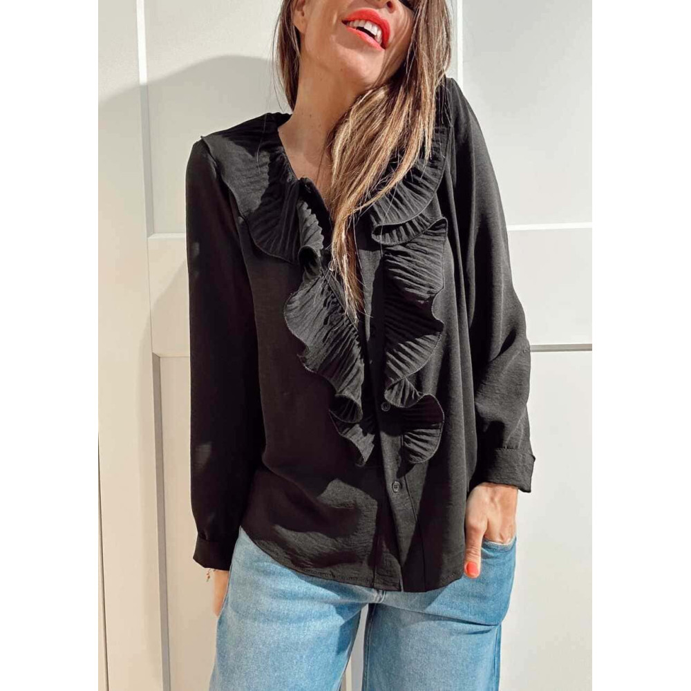 - Blusa ligera confeccionada en tela fina y fluida con detalle de chorreras plisadas.