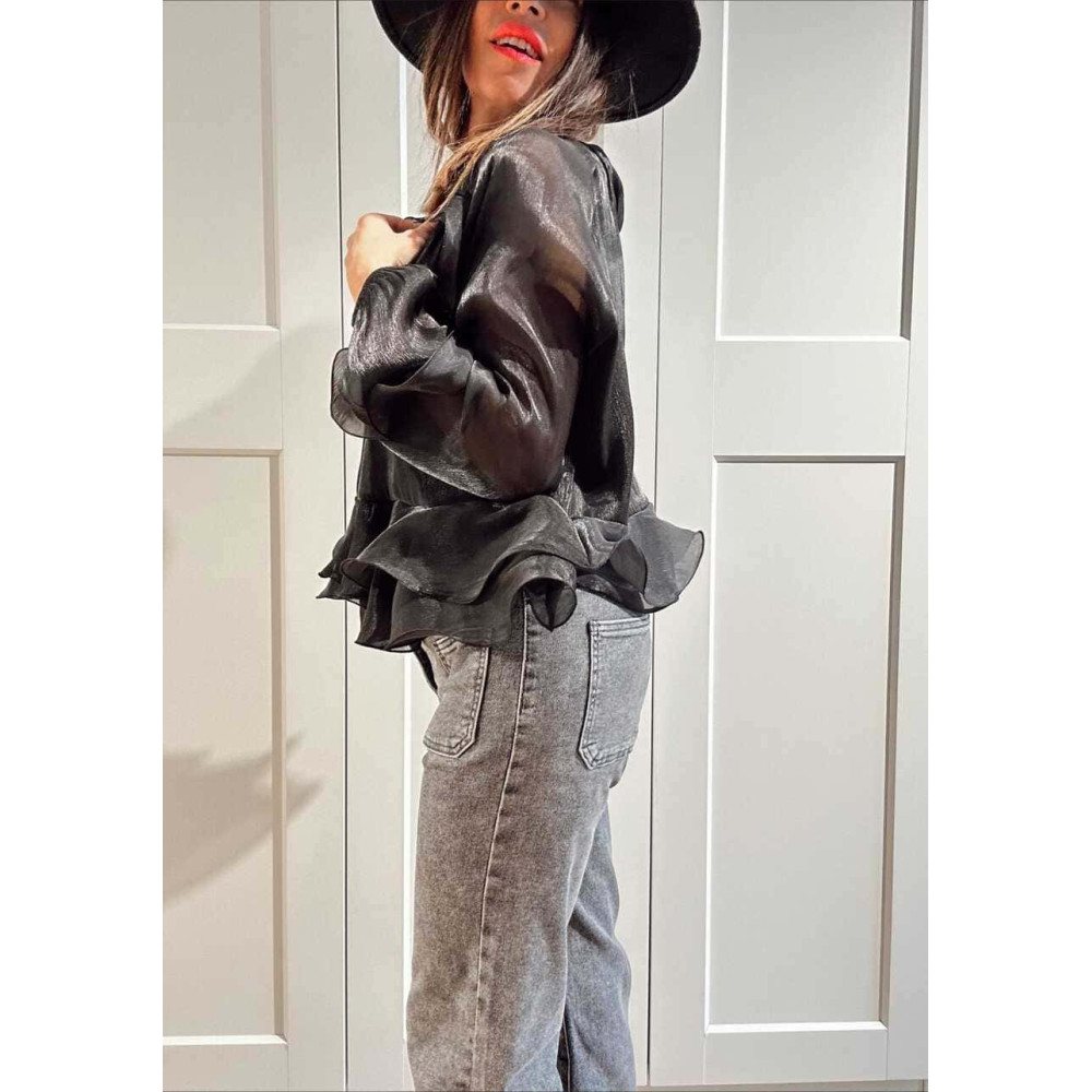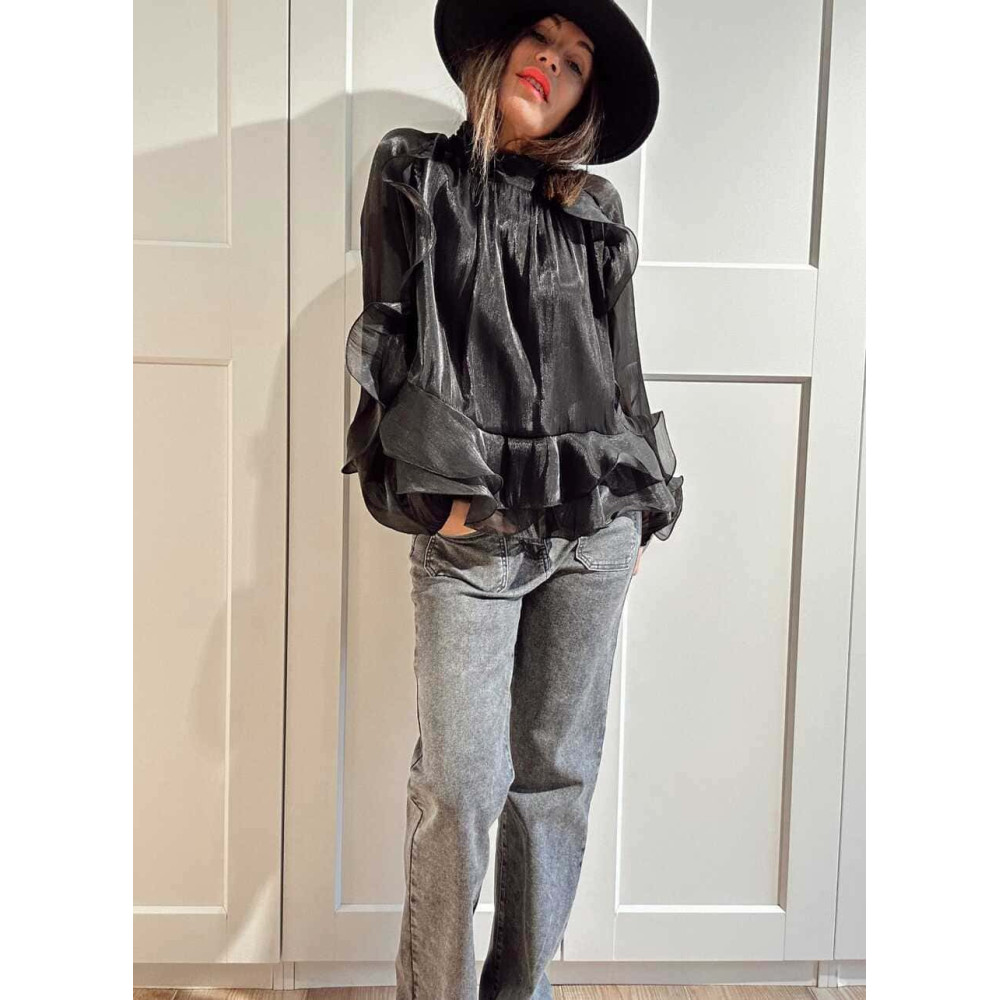 - Blusa ligera de tela vaporosa semitransparente con detalle de volantes.