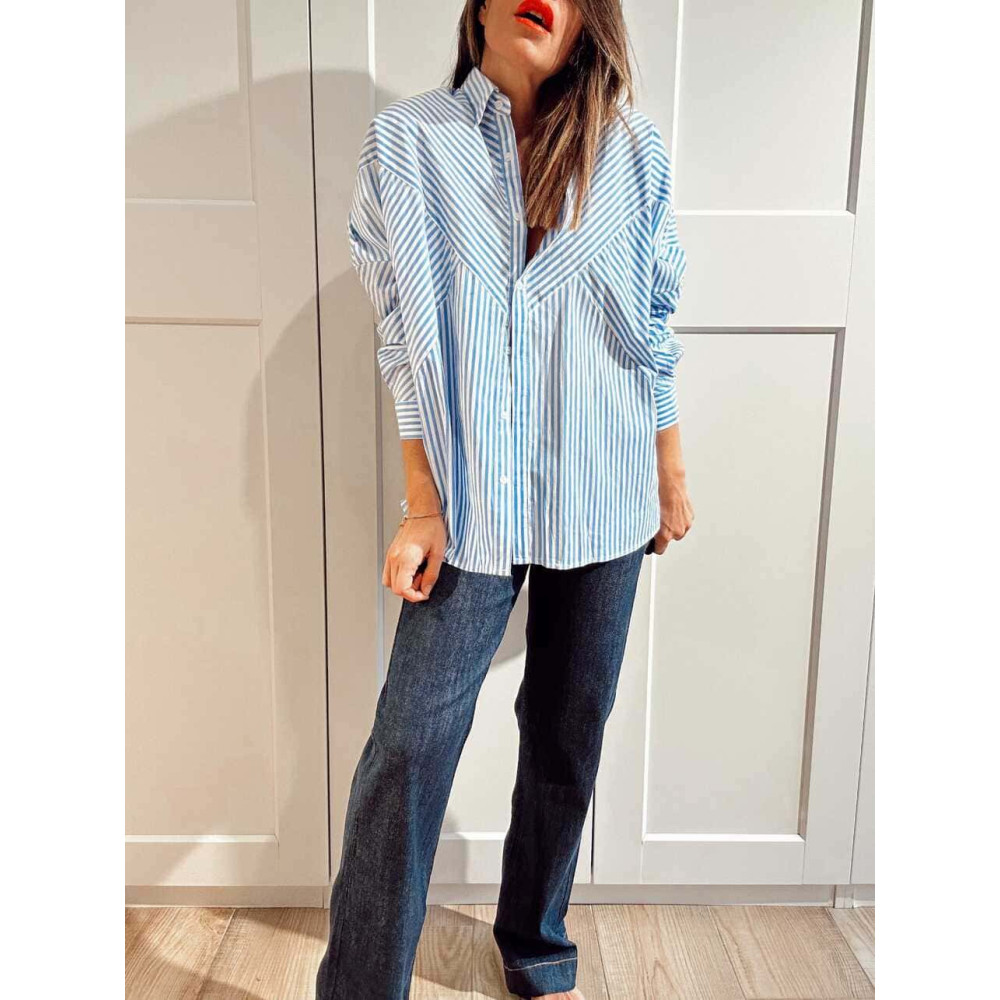 - Camisa de mujer corte oversize con estampado rayas en combinación azul celeste/blanco.