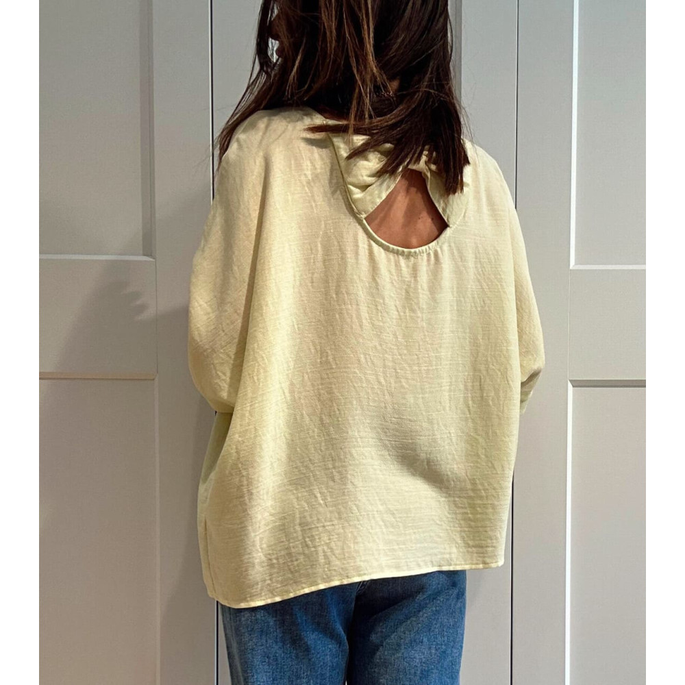 - Blusa corte oversize con abertura en la espalda y aplique efecto lazo.