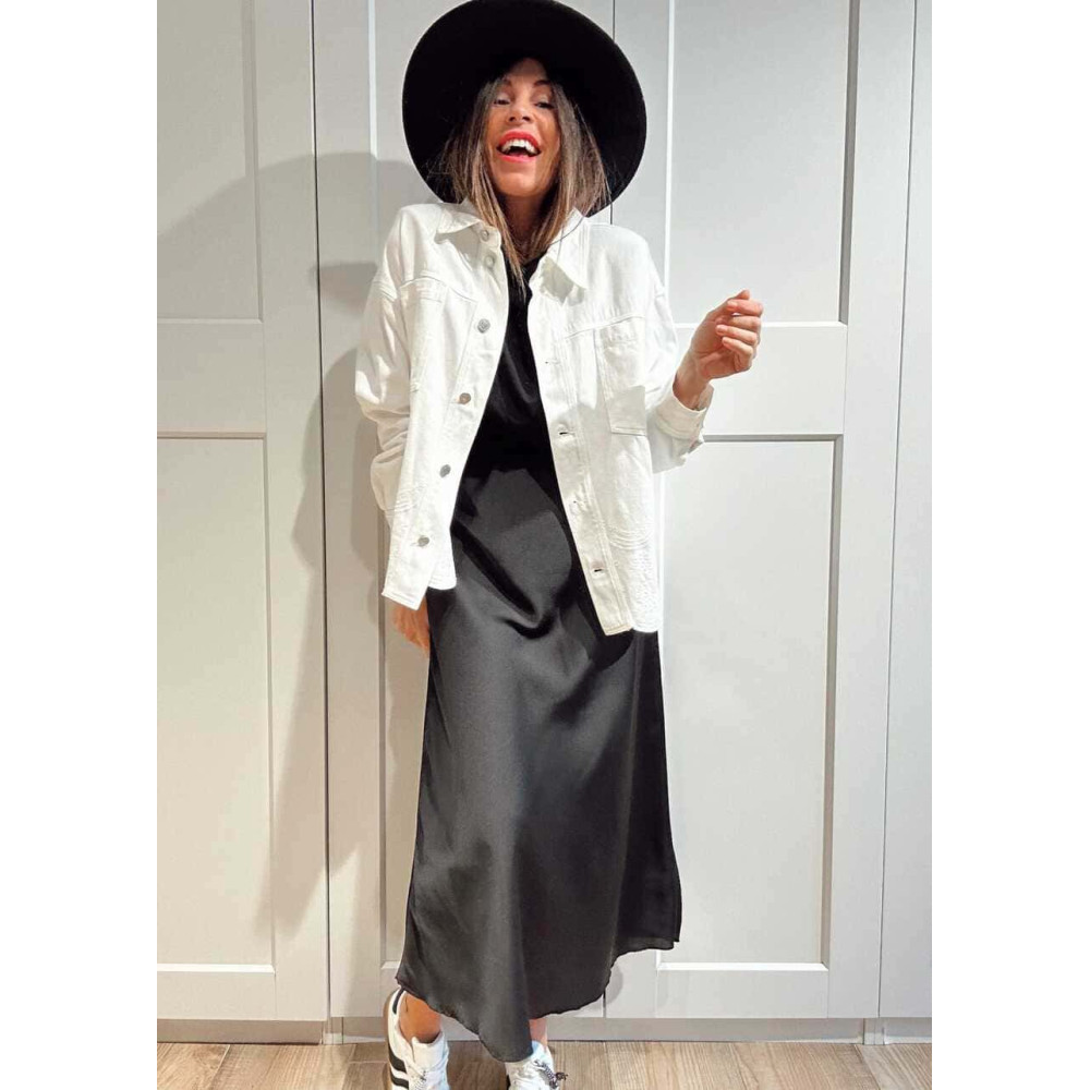 - Cierre completo en delantero mediante botones metálicos plateados.