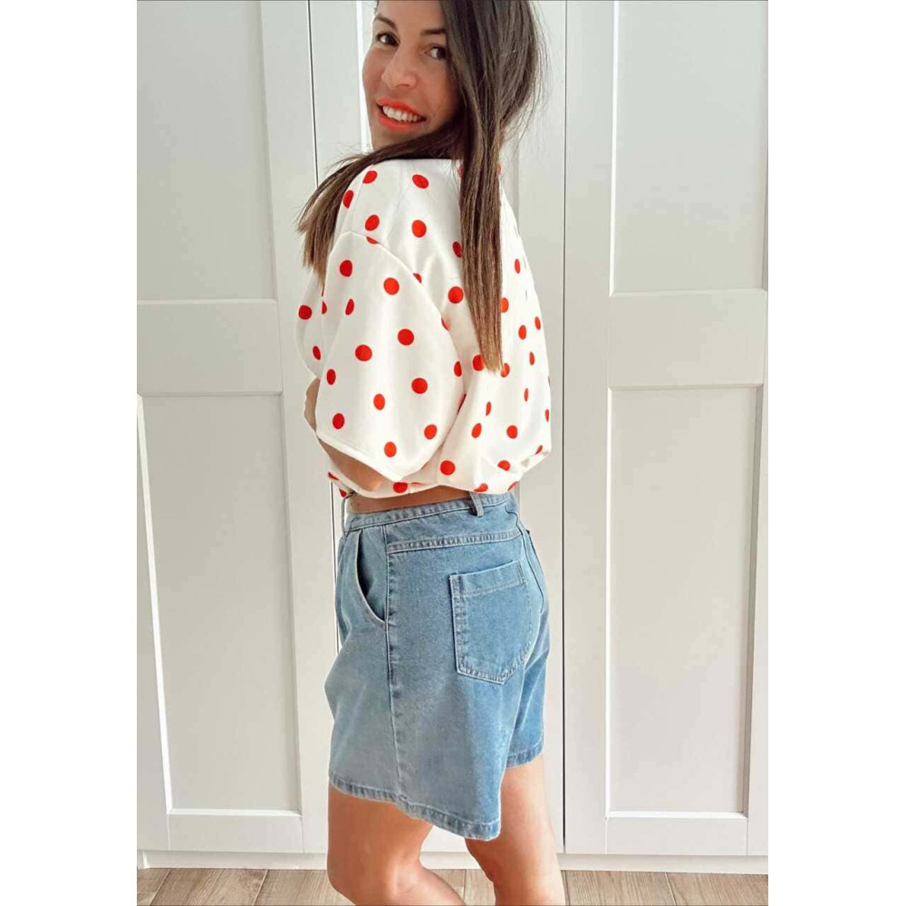- Cuerpo con estampado lunares en combinación crudo/rojo.