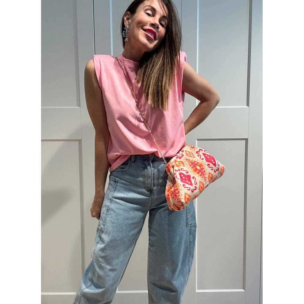 <li><strong>Estampado étnico</strong> en tonos beige, naranja flúor y magenta.</li>