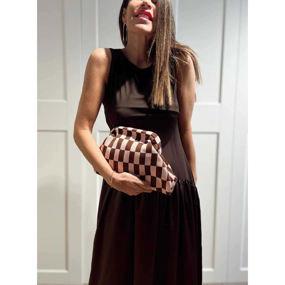 - Estampado cuadros tipo damero en combinación marrón/rosa.