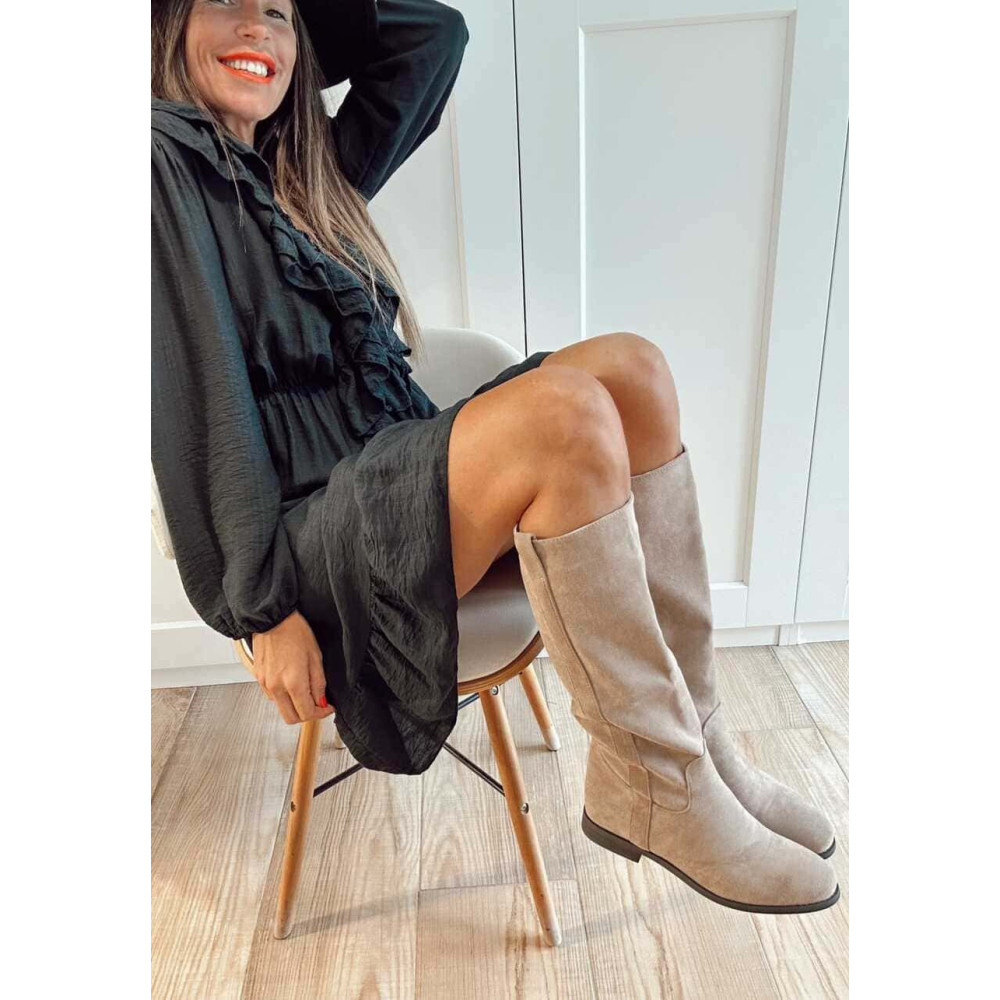 - Bota campera de estilo rociero fabricada en material sintético efecto ante.