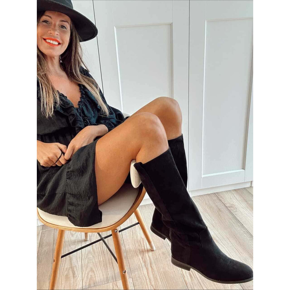 - Bota campera de estilo rociero fabricada en material sintético efecto ante.