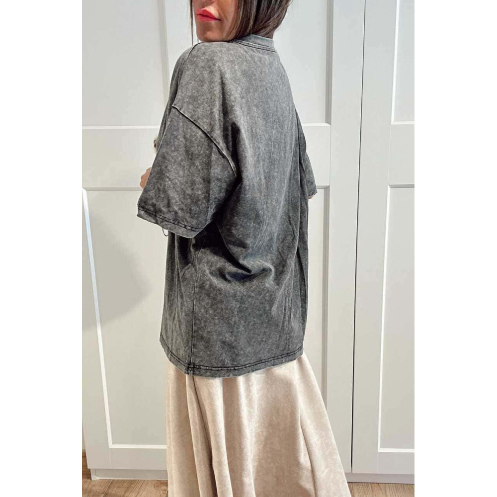 - Camiseta de mujer corte oversize con cuello redondo y manga corta.