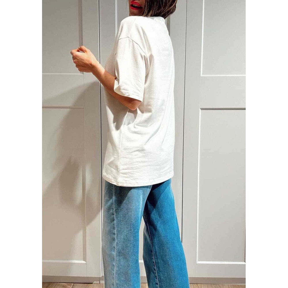 - Camiseta corte oversize con cuello redondo y manga corta.