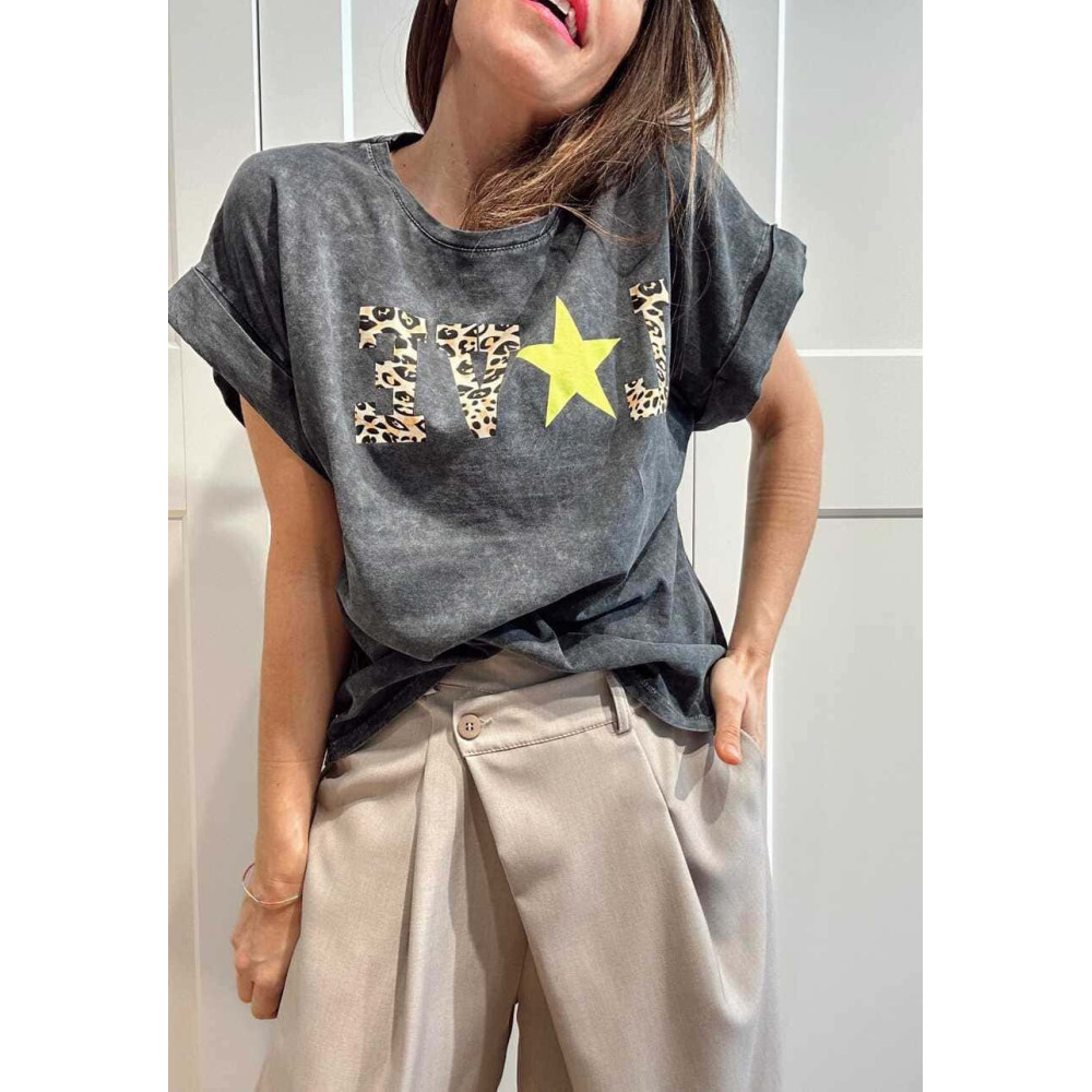 - Diseño con estrella y mensaje "LOVE" estampado animal print impreso en delantero.