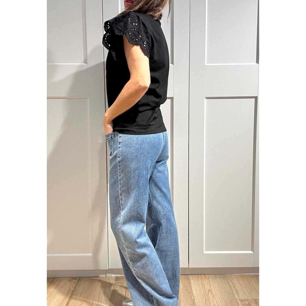 - Camiseta de mujer con volante popelín bordado-perforado en la manga.