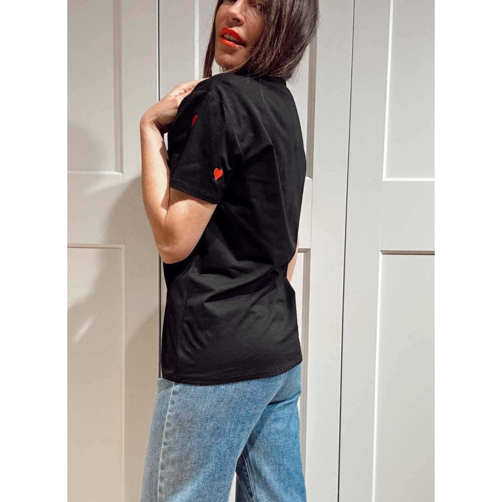 • Camiseta básica de mujer con detalle de corazones rojos bordados en delantero.
