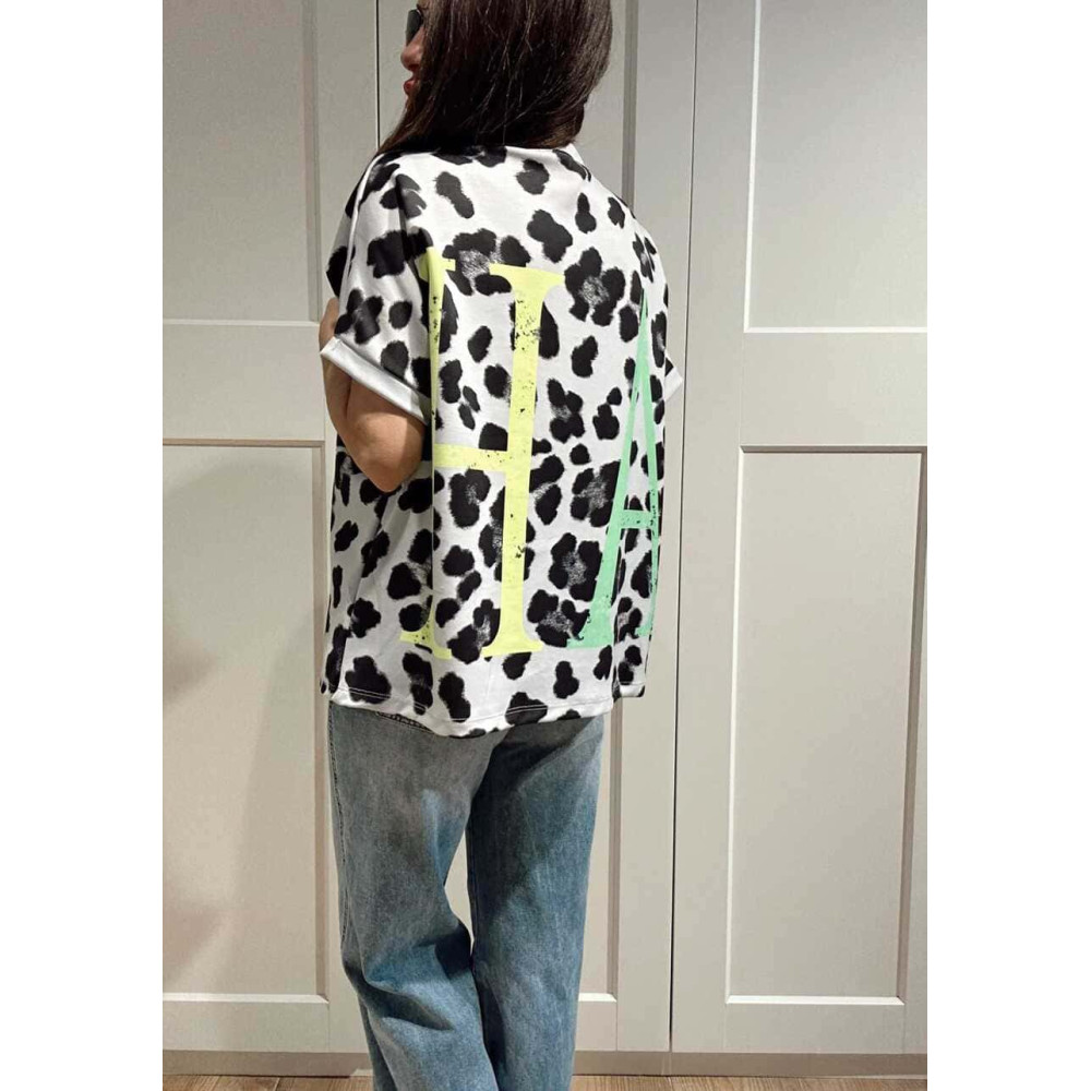 <li>Estampado<strong> animal print</strong> con lettering flúor en delantero y espalda.</li>