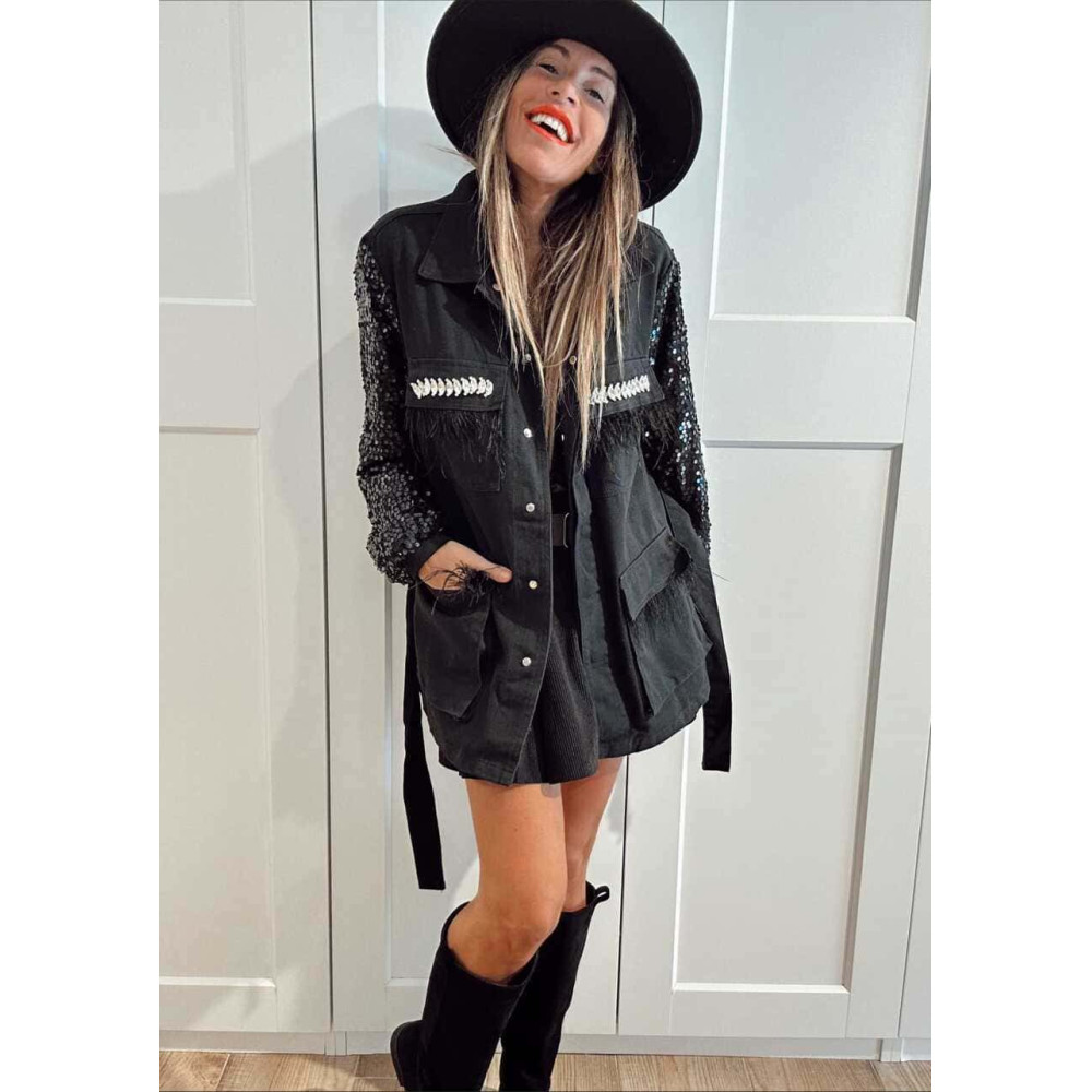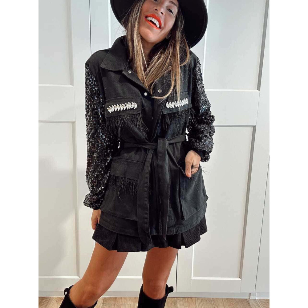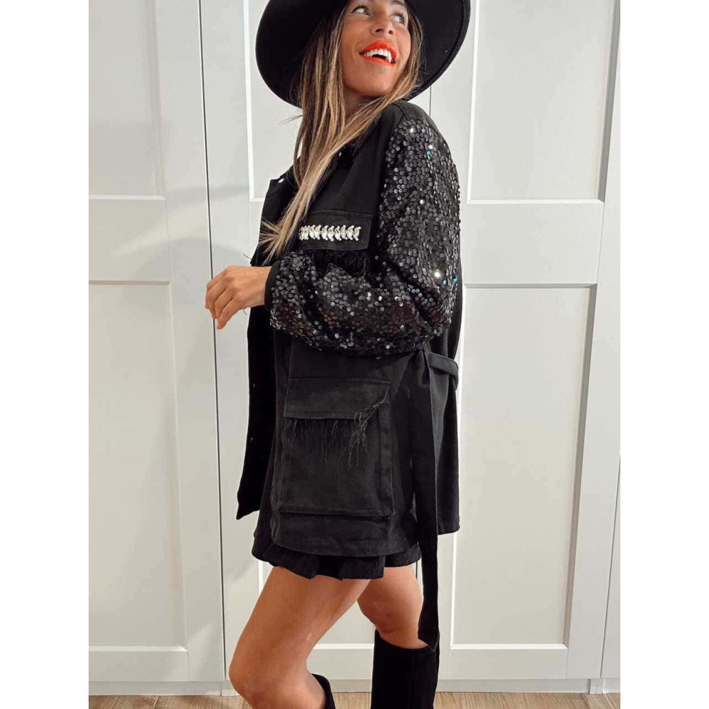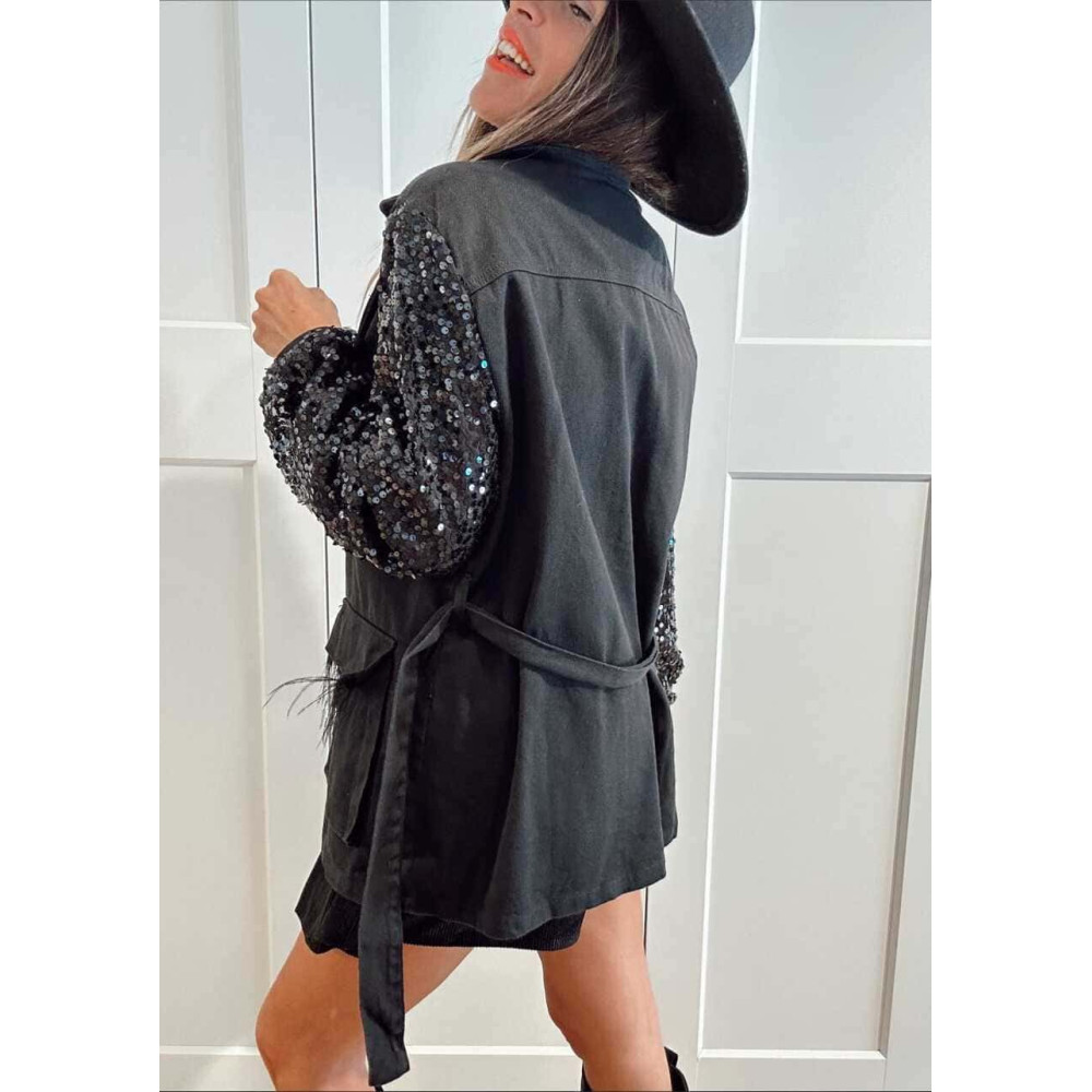 - Trench vaquera estilo sahariana con mangas de lentejuelas y cinturón lazada.