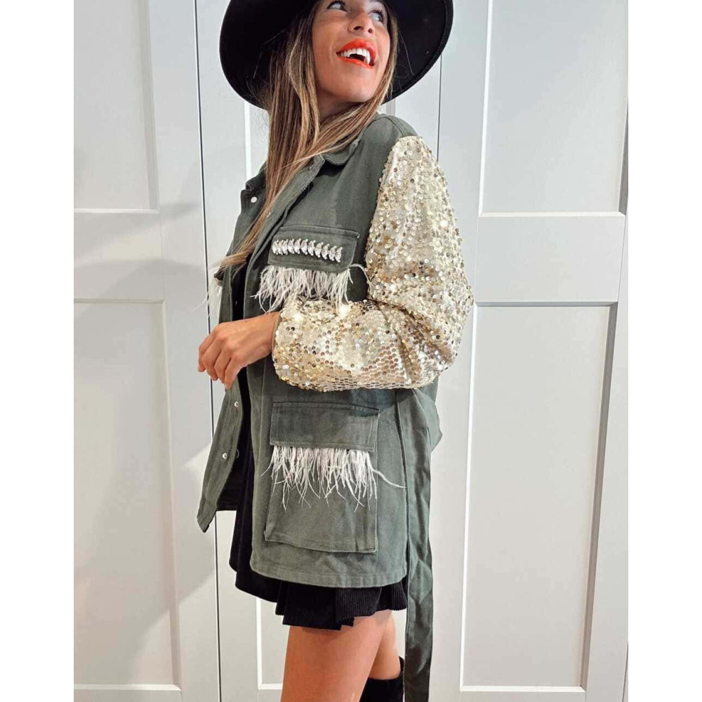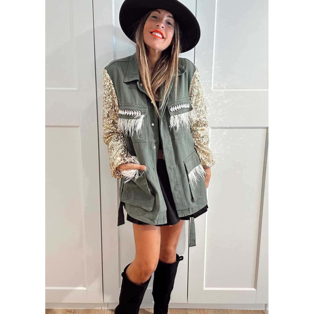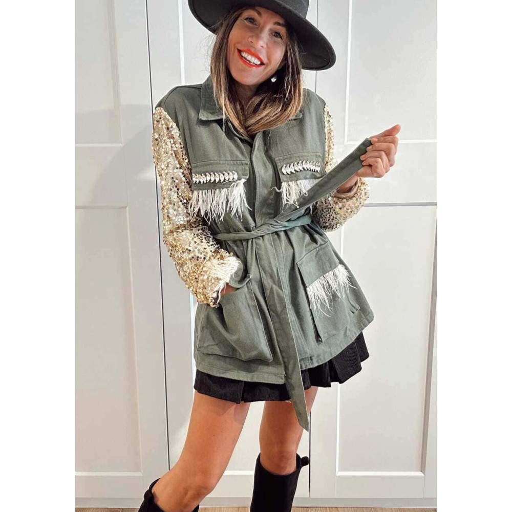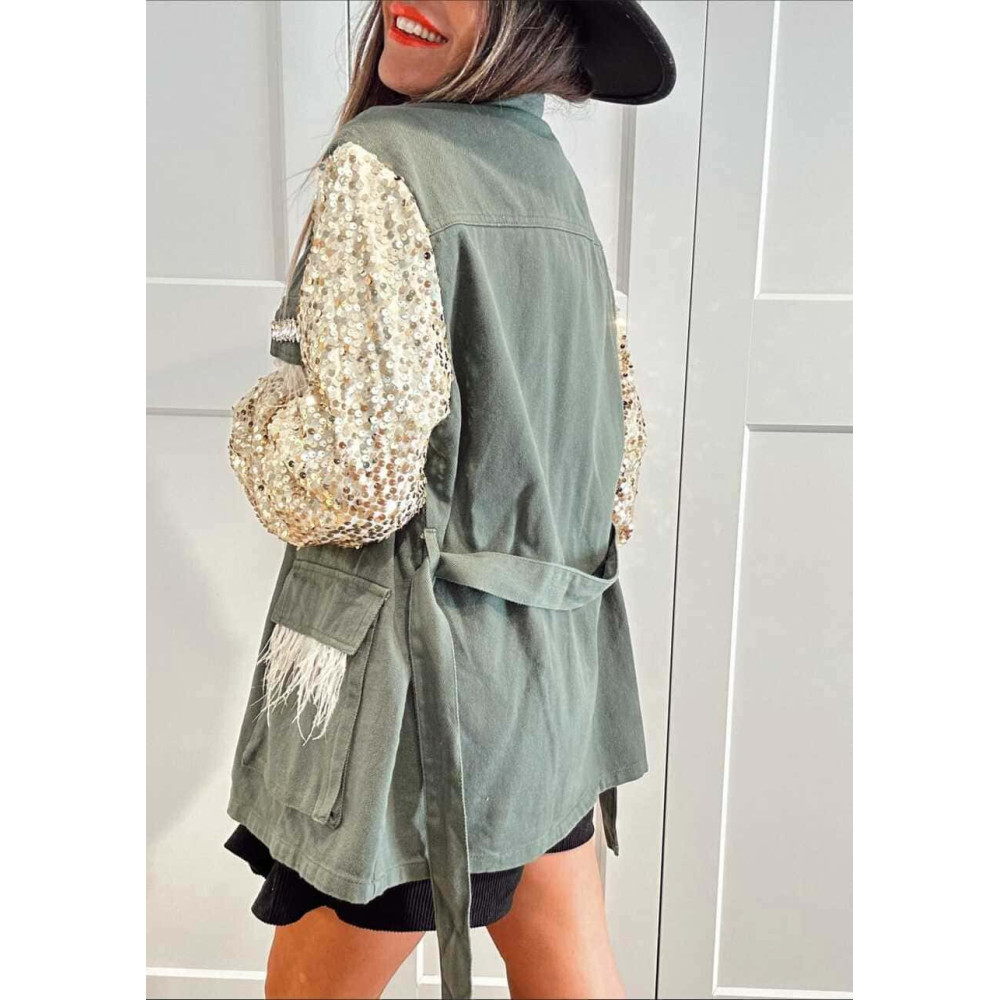 - Trench vaquera estilo sahariana con mangas de lentejuelas doradas y cinturón lazada.