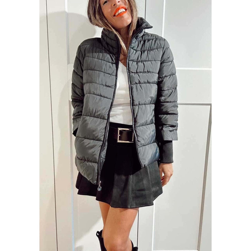 - Chaqueta acolchada de mujer con acabado nylon y costuras horizontales.