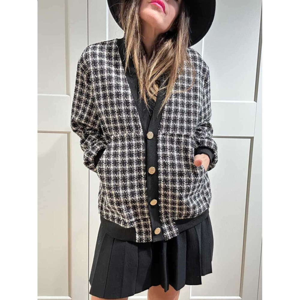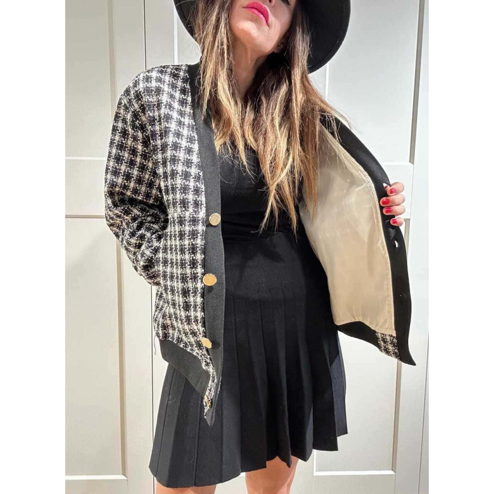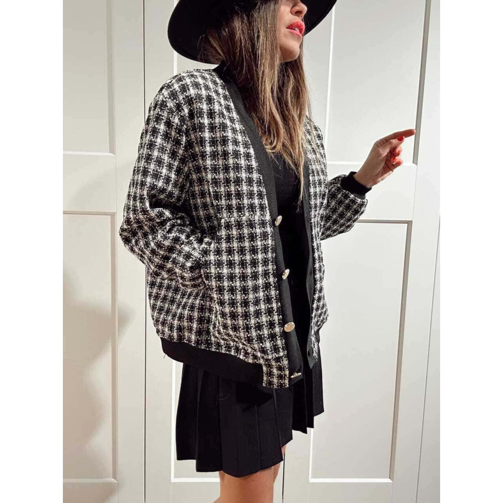 - Chaqueta de estilo retro confeccionada en tejido tweed con estampado pata de gallo negro/blanco.