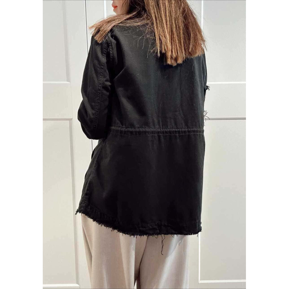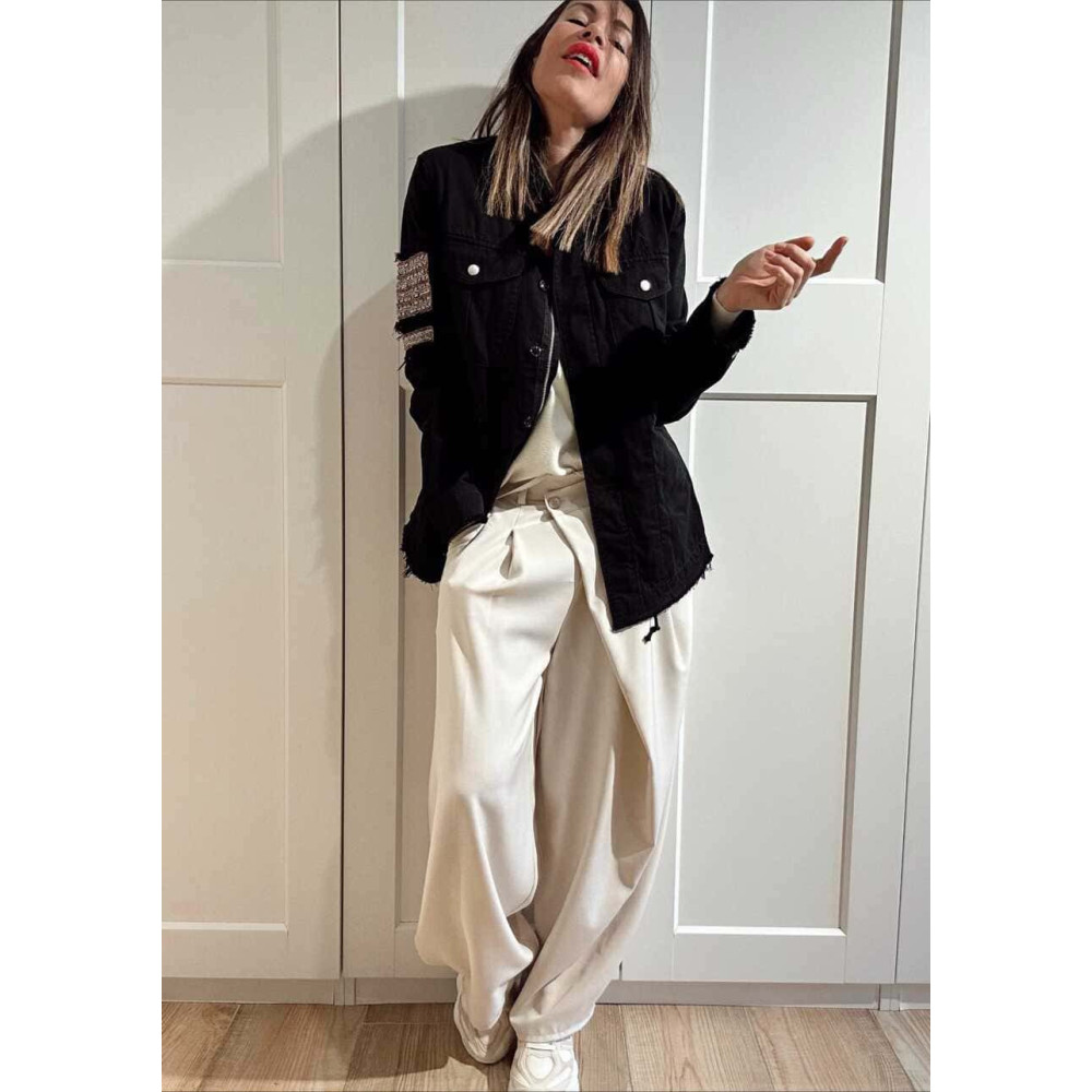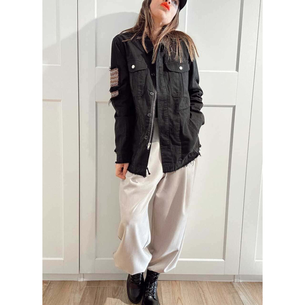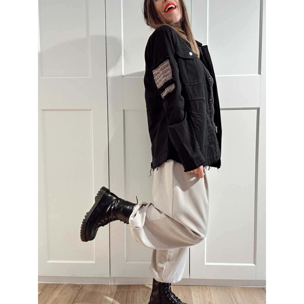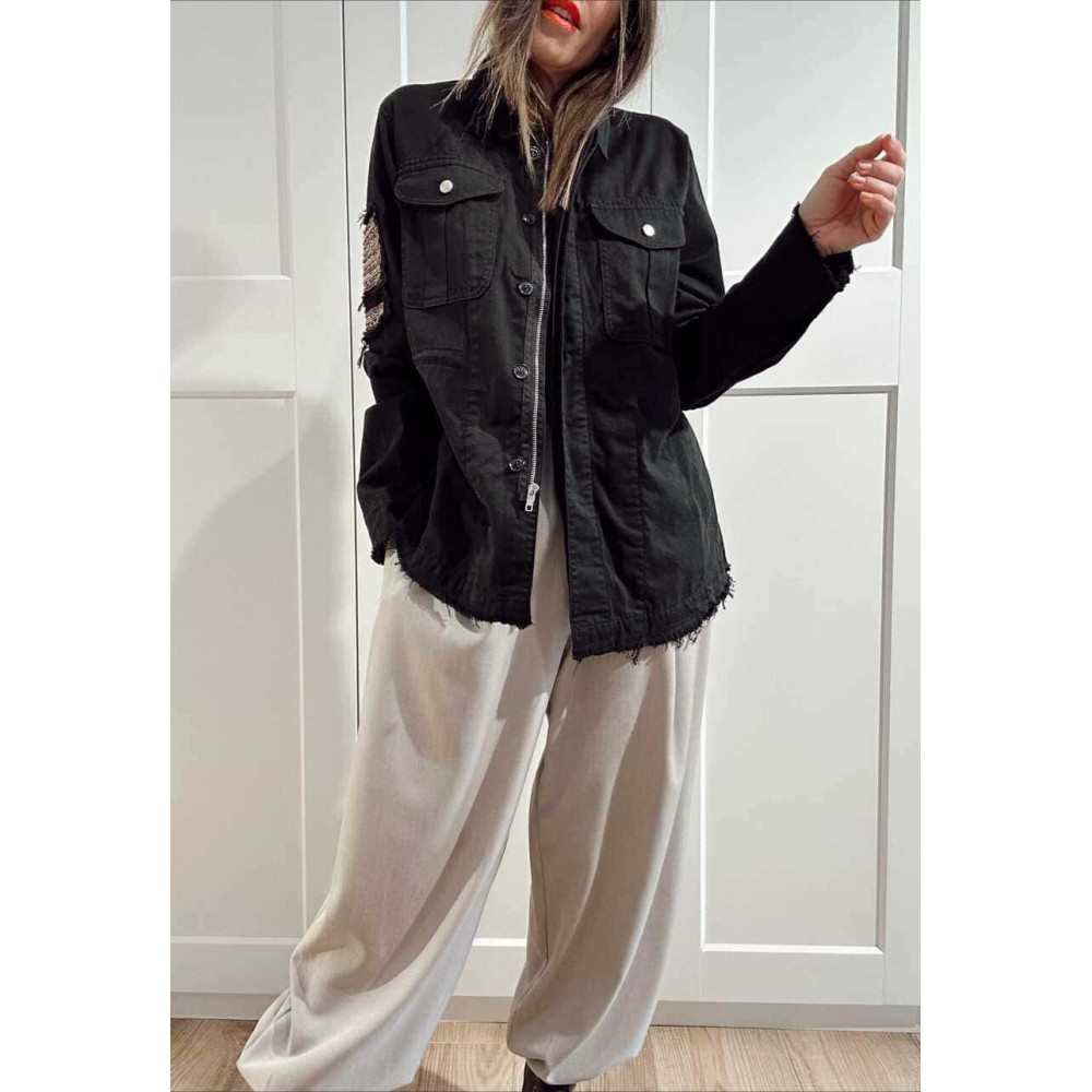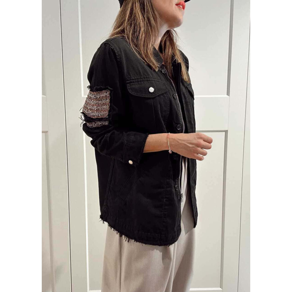 - Chaqueta tipo sahariana con detalle de parches con micro-abalorios en la manga.