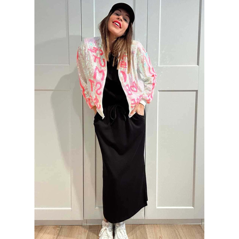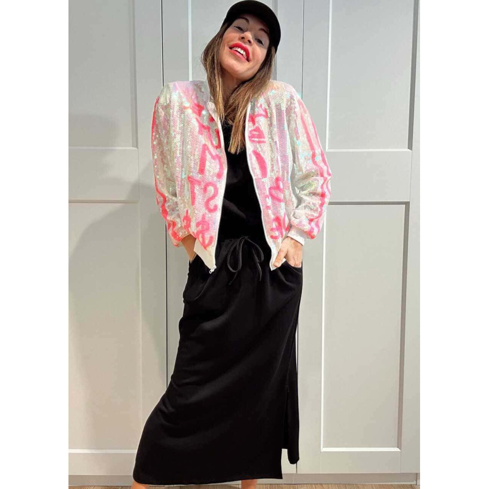 Bomber Lentejuelas Lettering THE BEST DRESSED Blanco