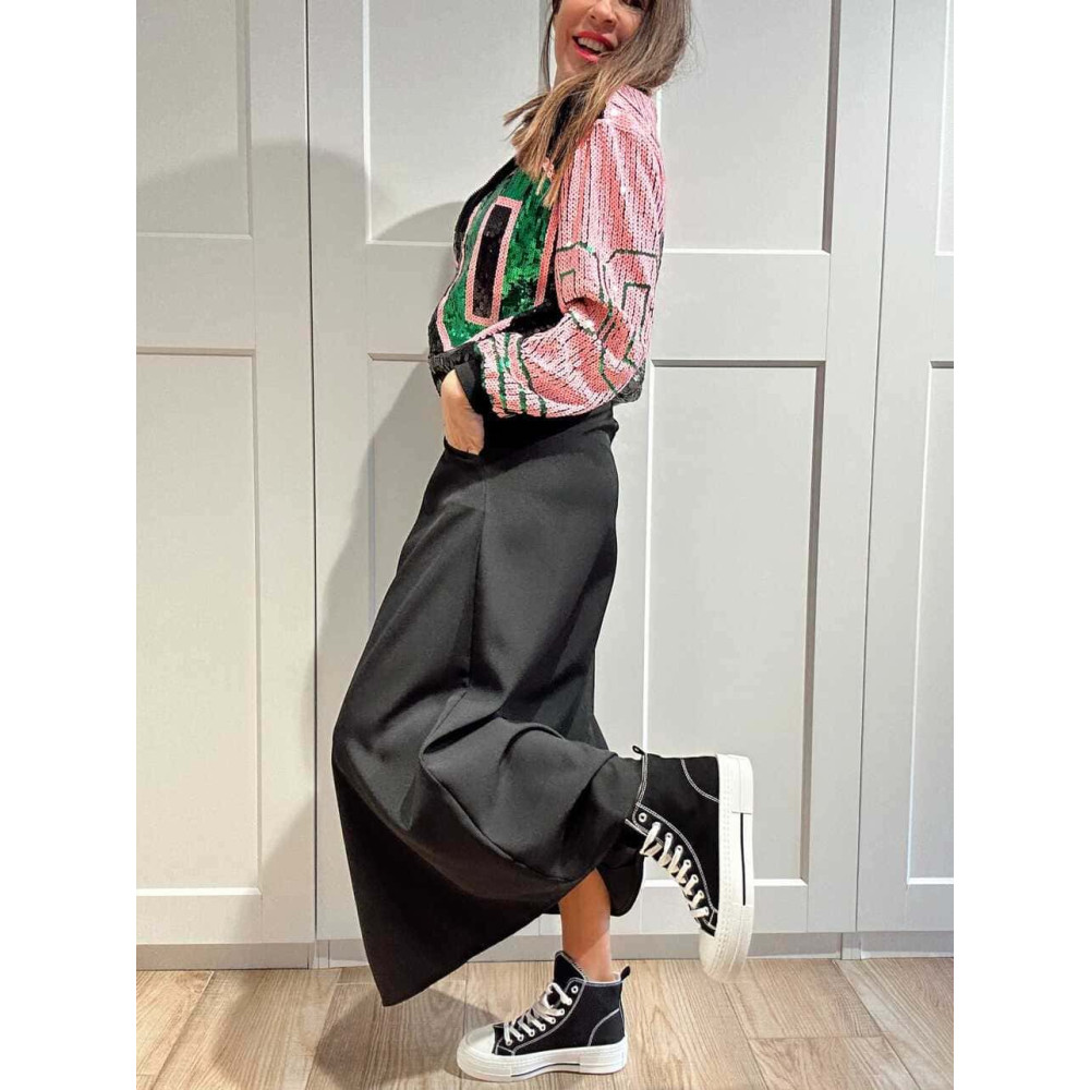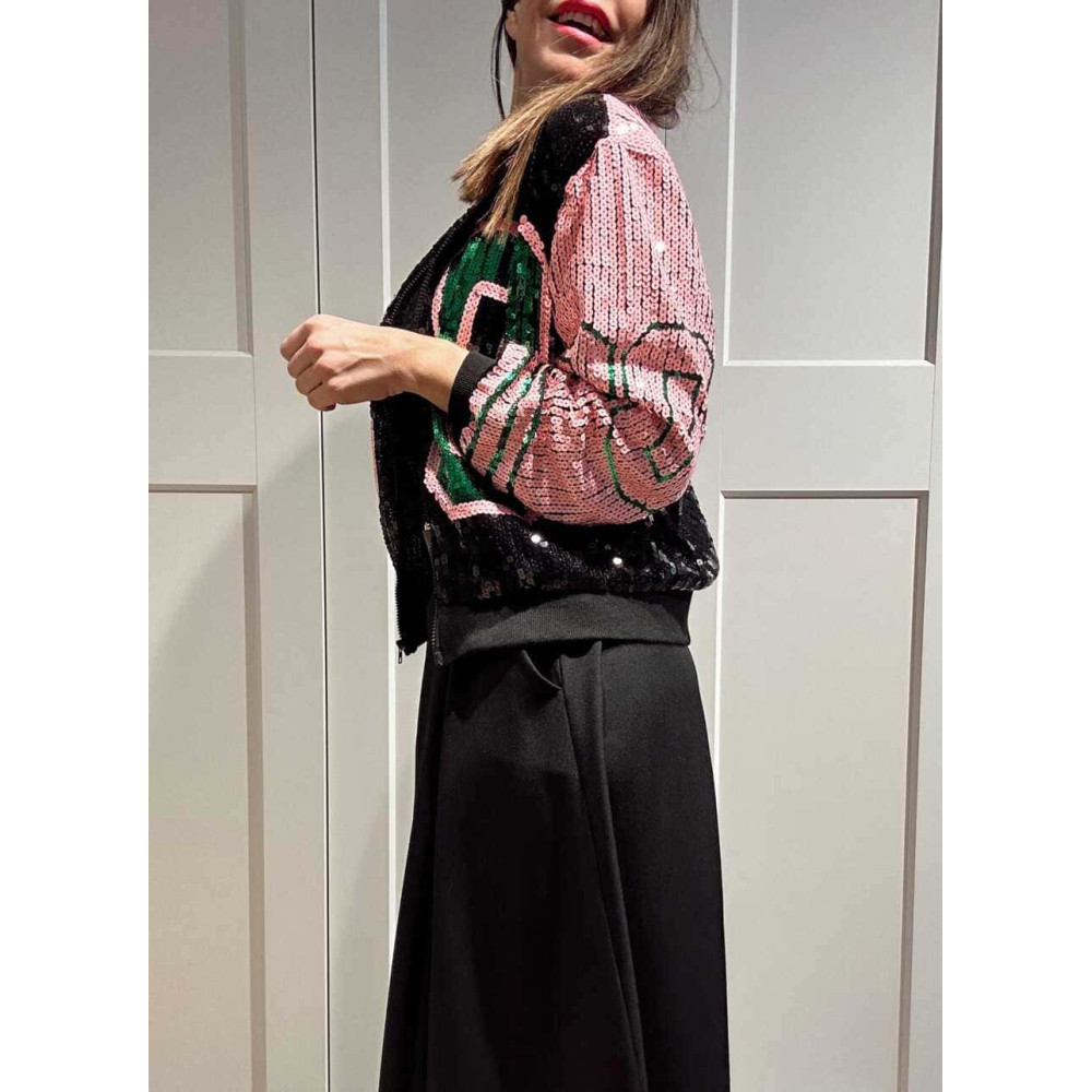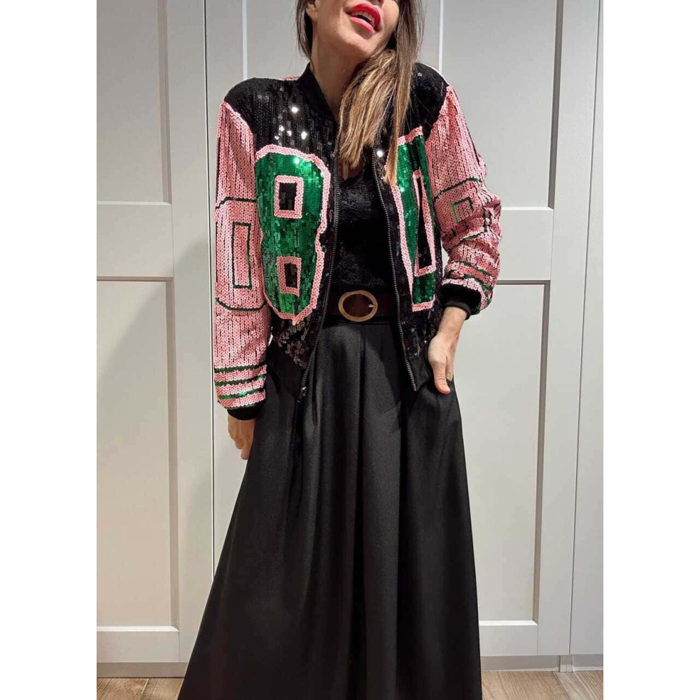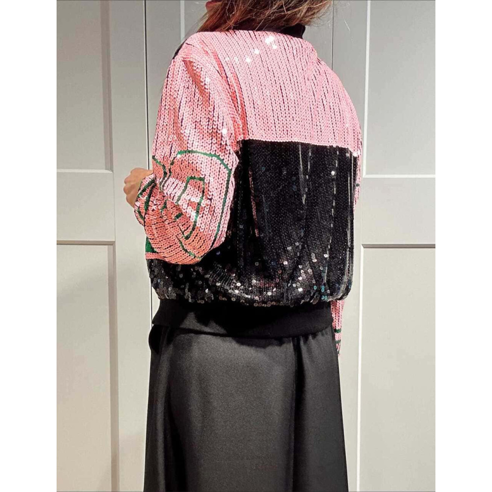 - Chaqueta fina tipo bomber con acabado lentejuelas en tonos negro, rosa y verde.