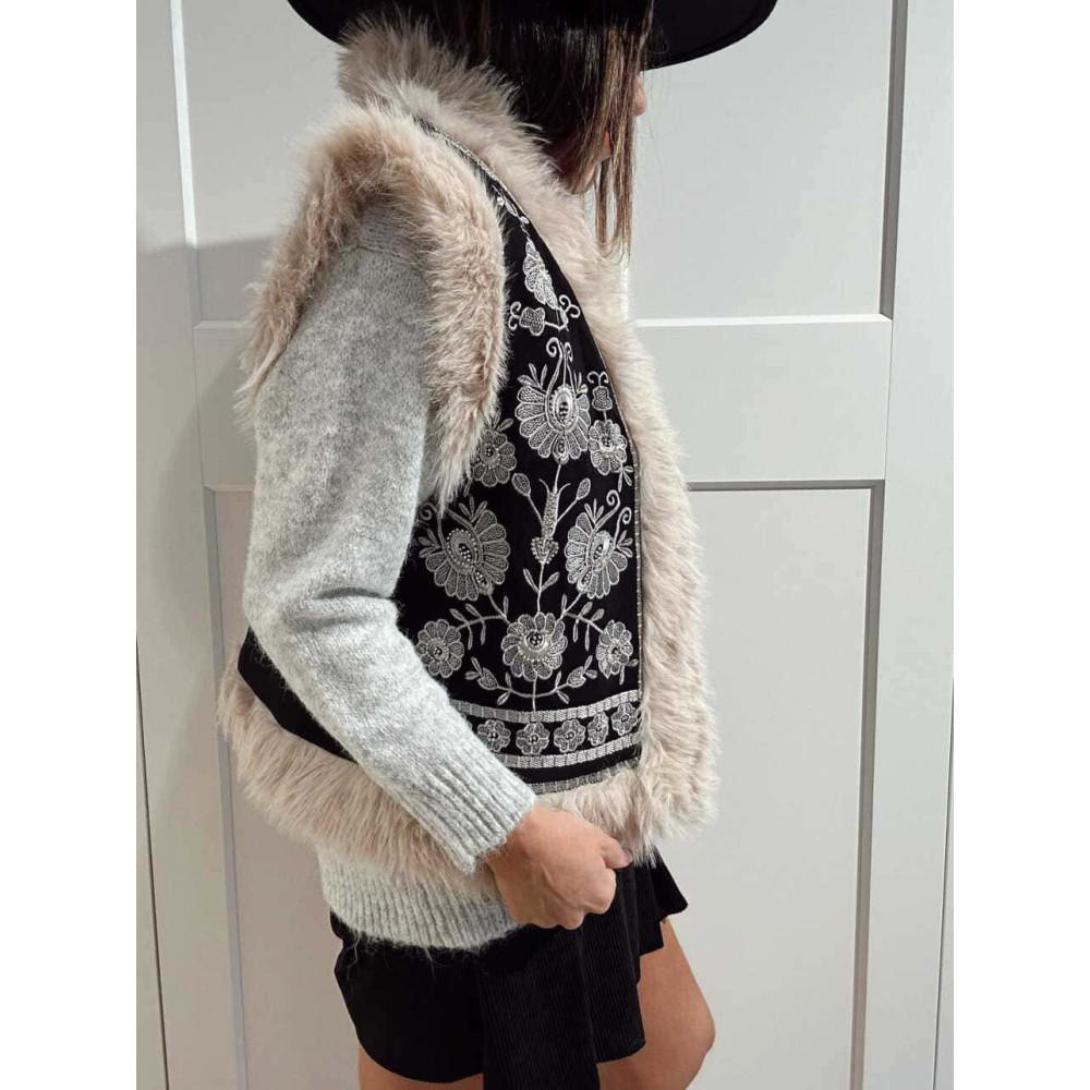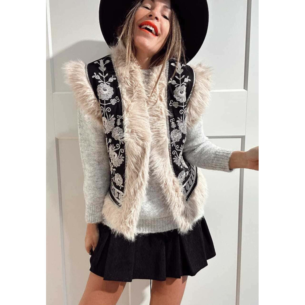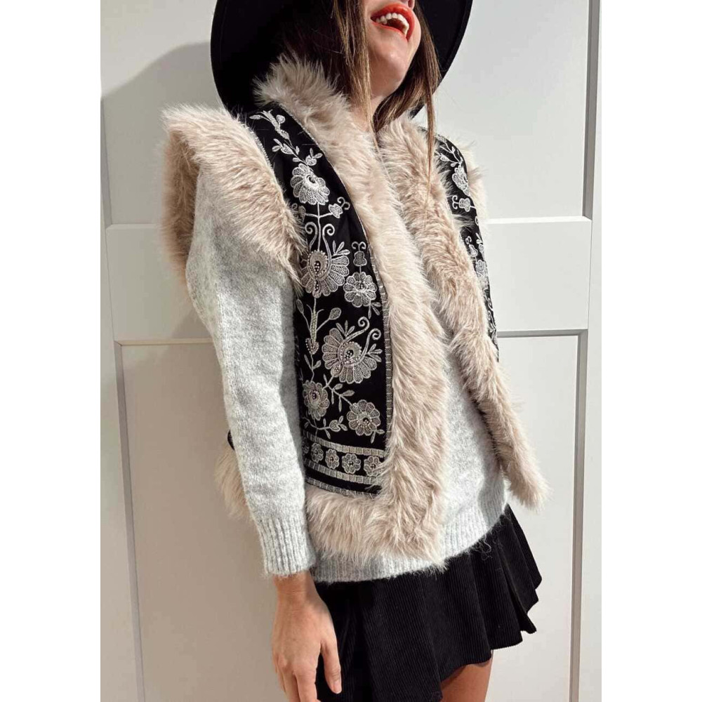 • Chaleco negro de mujer con pelo sintético color beige (no extraíble) en las terminaciones.