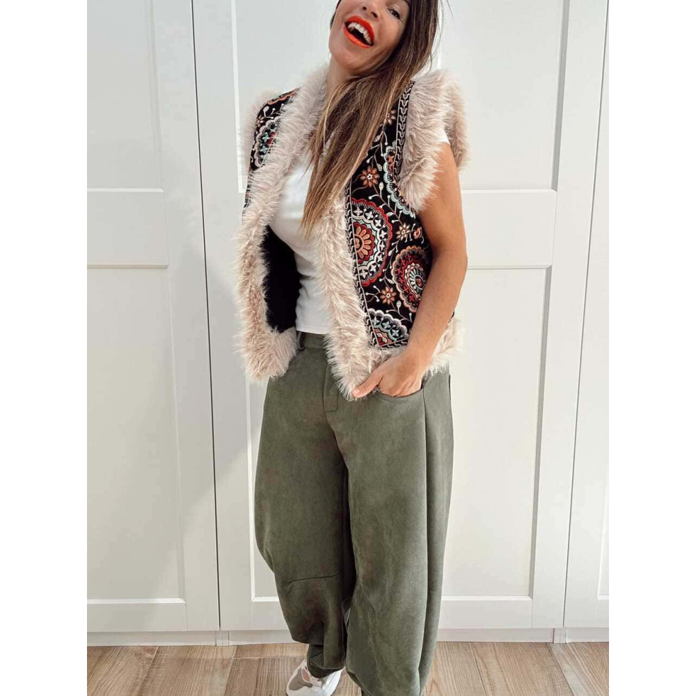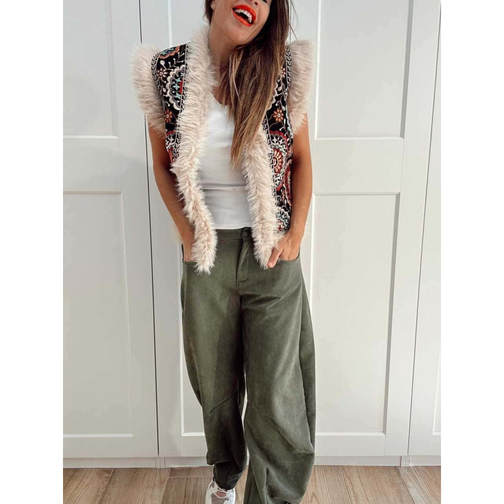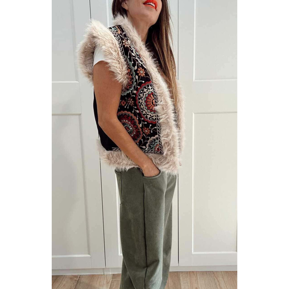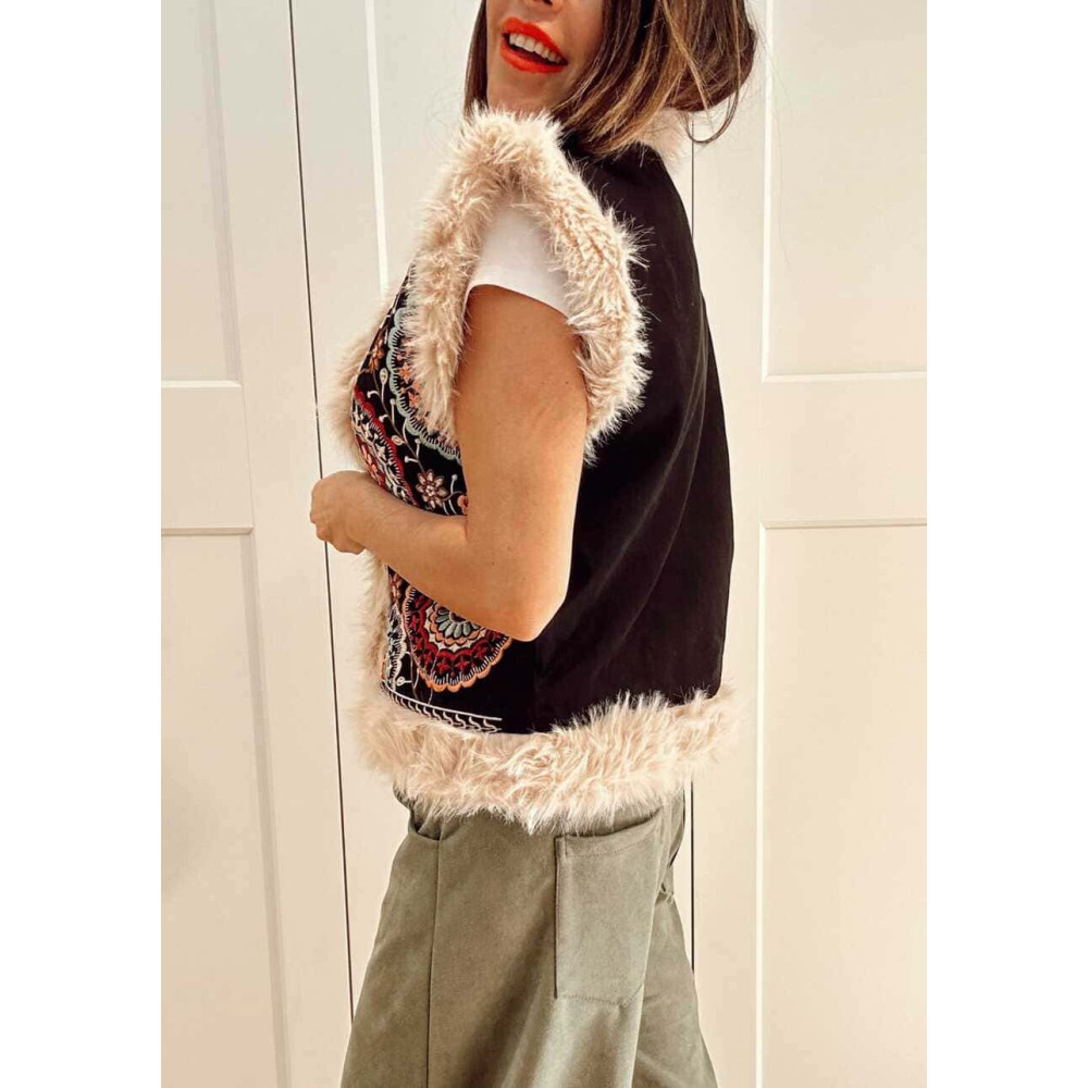 - Chaleco negro de mujer con pelo sintético color beige (no extraíble) en las terminaciones.