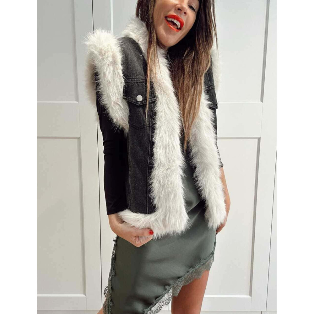 - Chaleco vaquero negro con pelo sintético (no extraíble) color beige en las terminaciones.