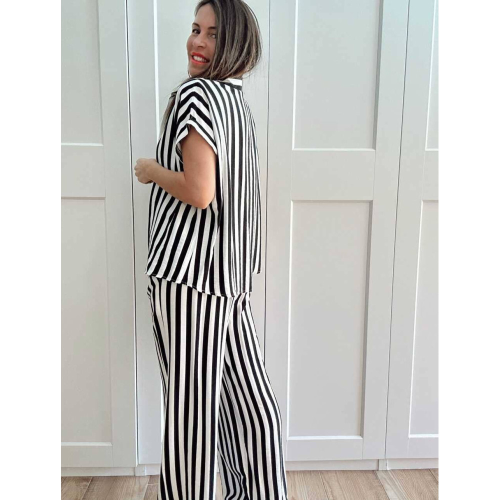 <p><strong>Conjunto dos piezas </strong><strong>estilo pijamero confeccionado en viscosa con mezcla de lino y estampado de rayas negro/blanco</strong><strong>. </strong><strong>Puedes llevarlo junto o por separado... ¡¡tú eliges!! </strong><b>❤</b></p>
