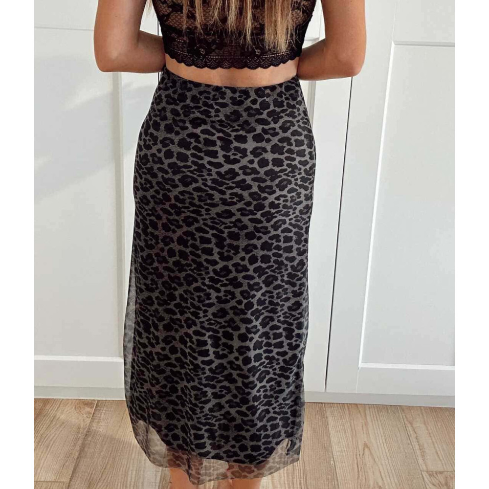 - Falda transparente de tull con estampado animal print en tonos gris y negro.