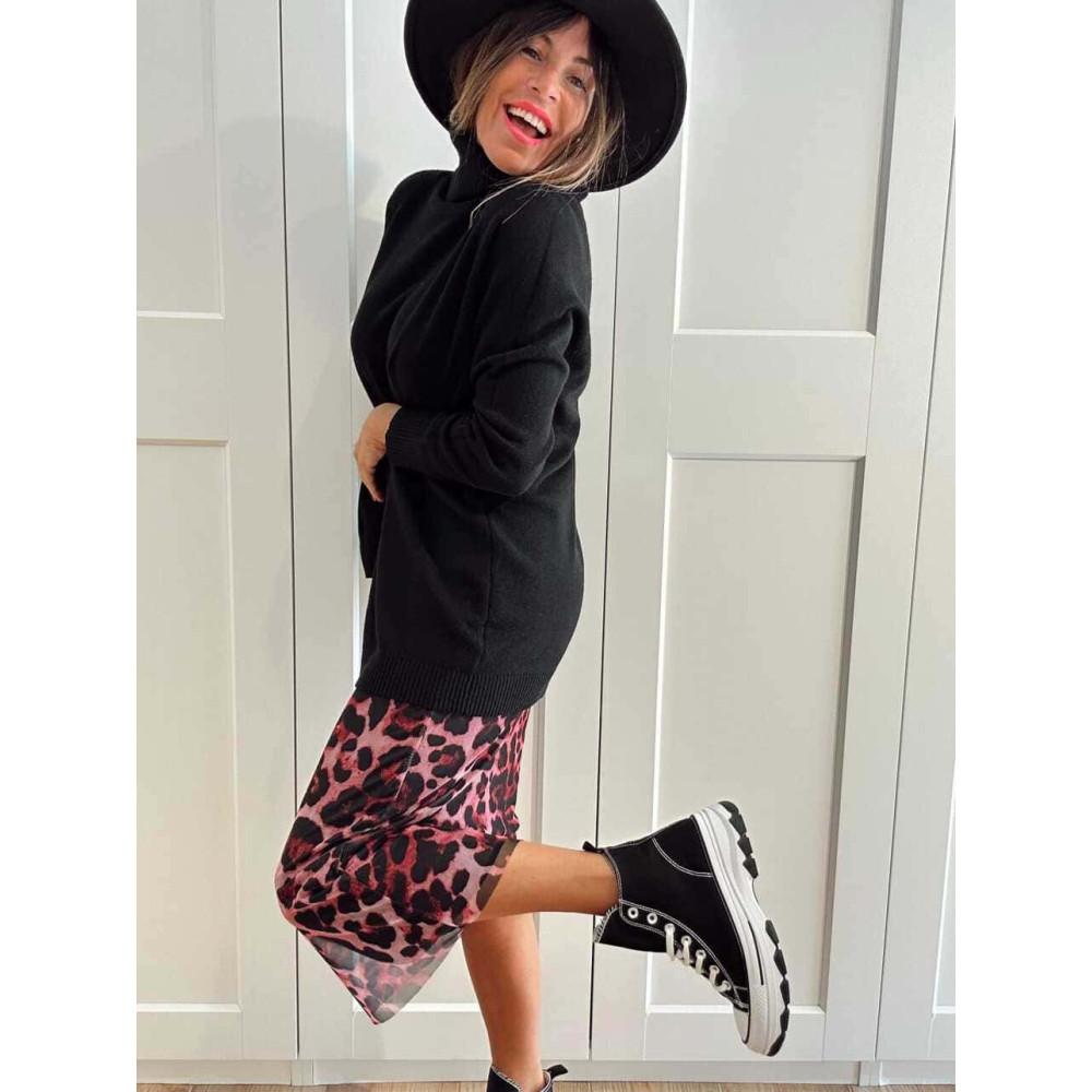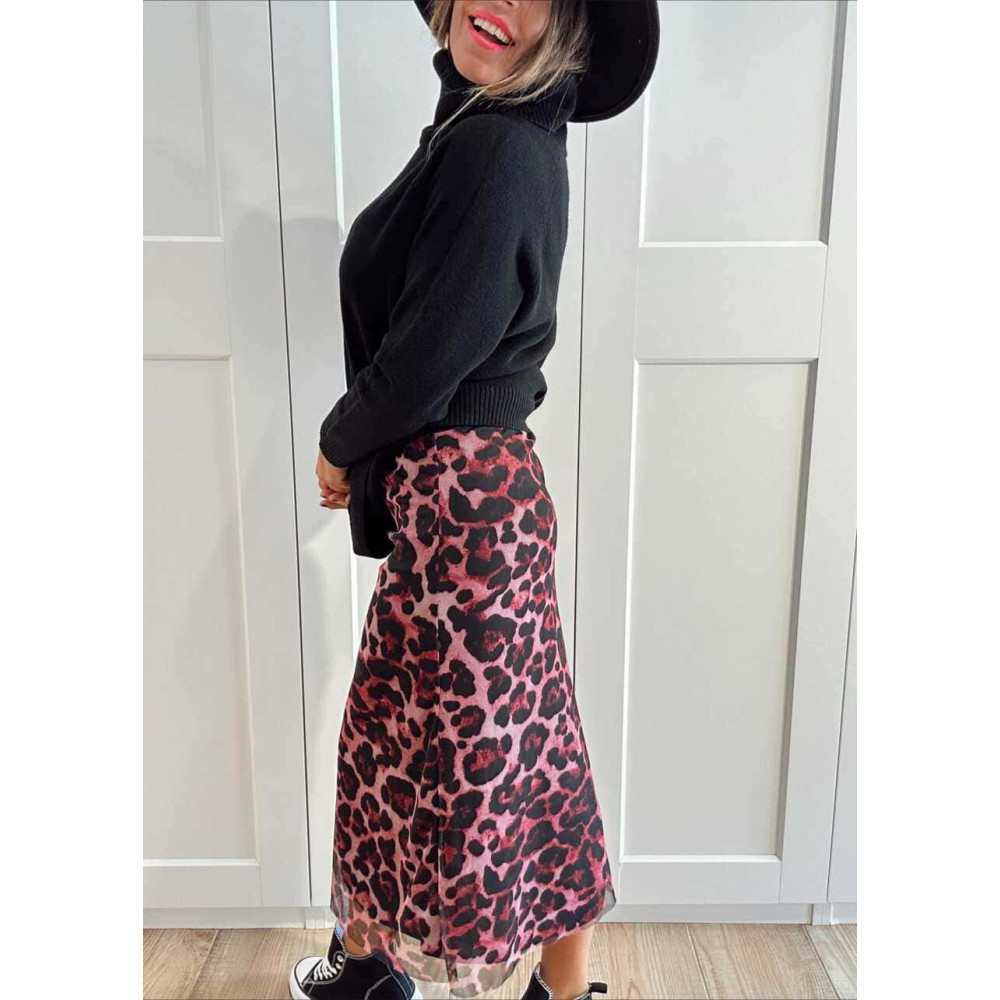 - Falda transparente de tull con estampado animal print en tonos rosa y negro.