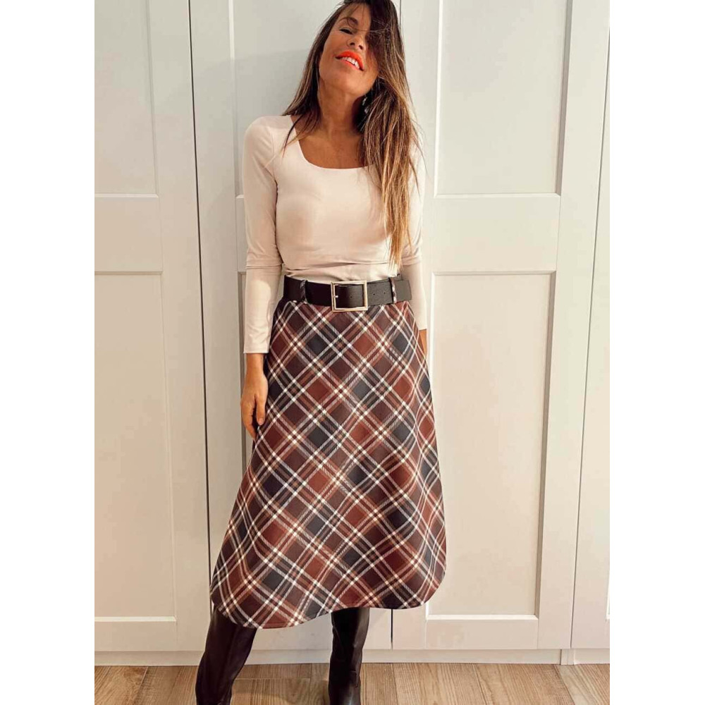 - Falda estilo preppy con estampado cuadro tartán en tonos marrón, azul acero y beige.