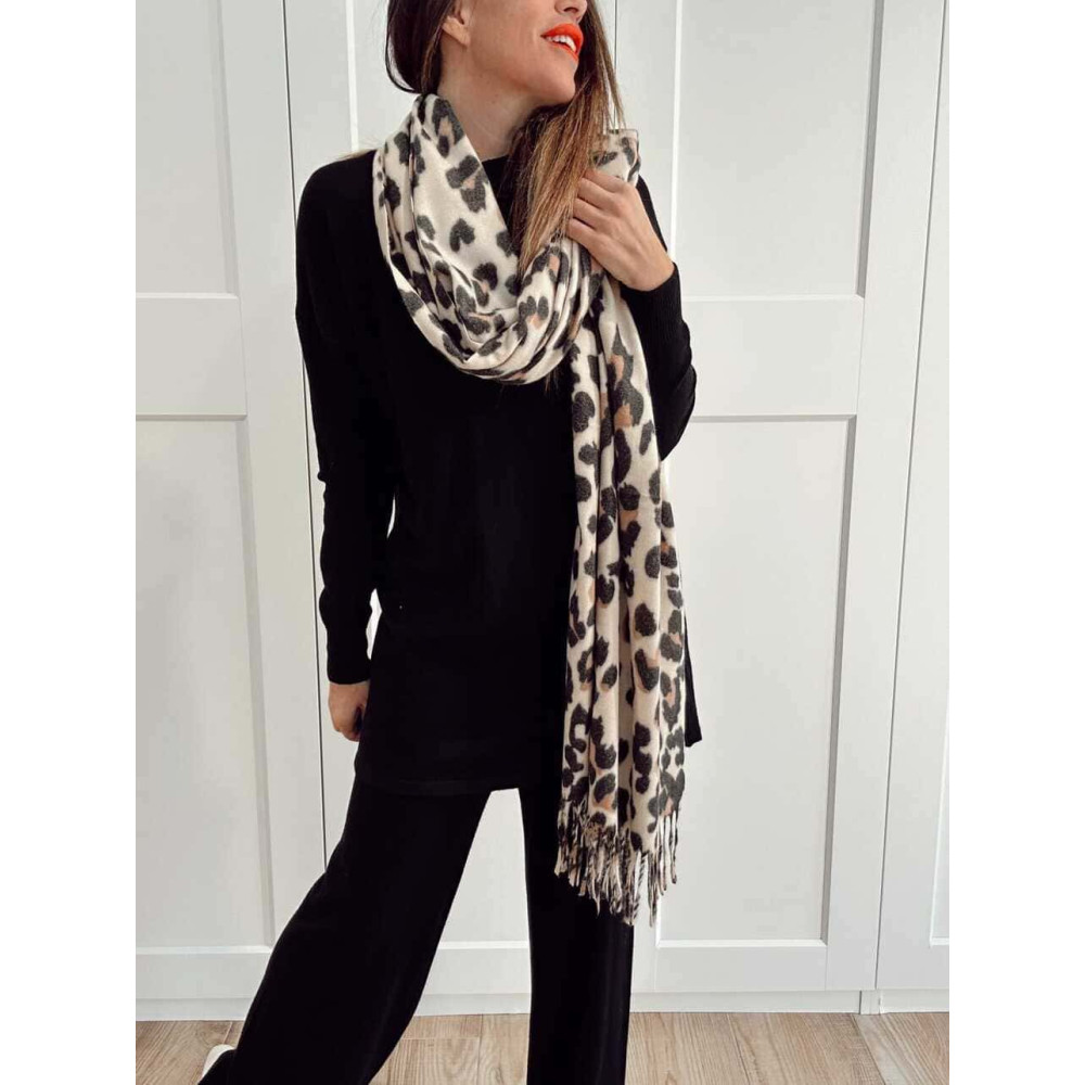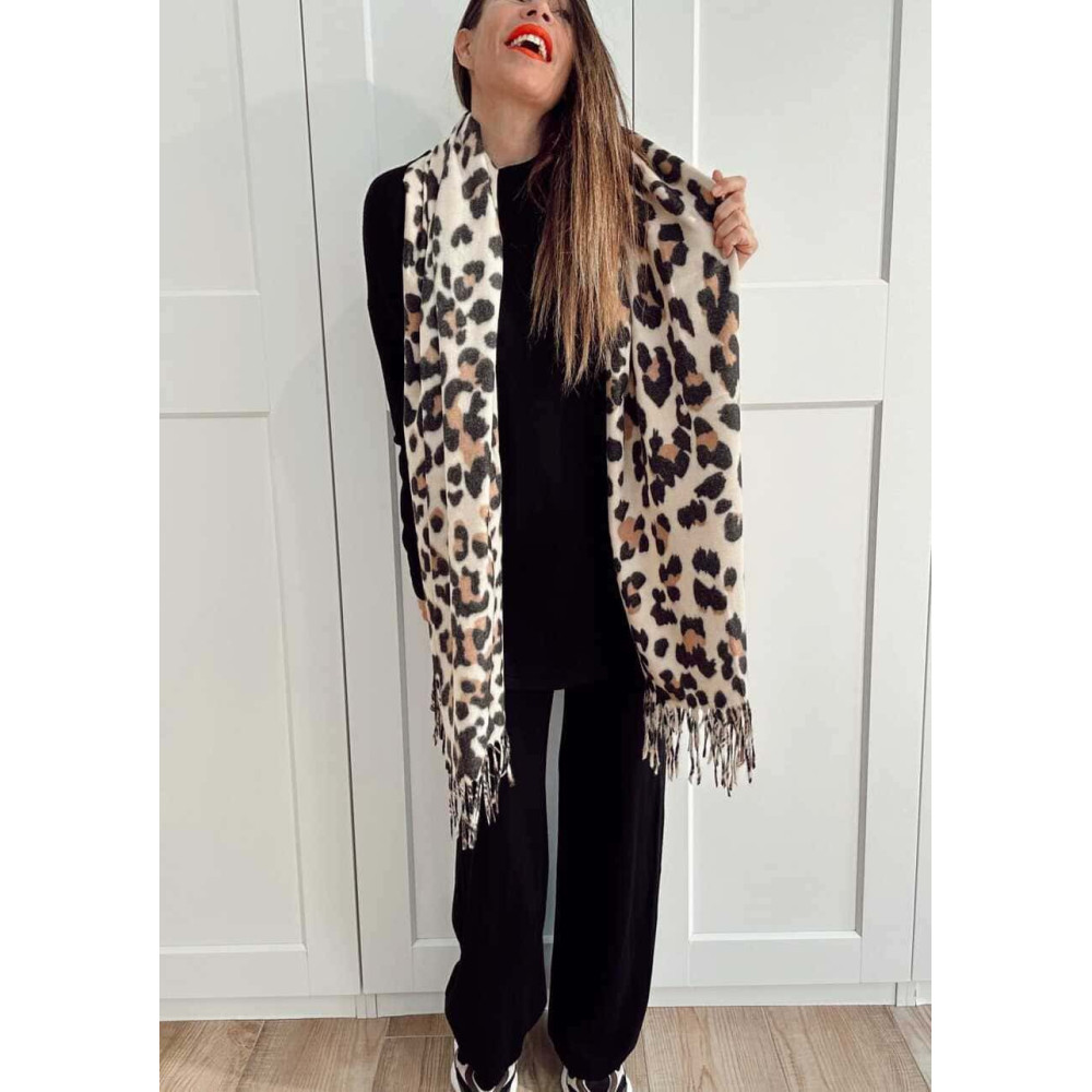 - Bufanda fina de tacto suave con estampado animal print en tonos beige, camel y negro.