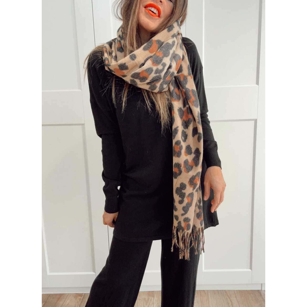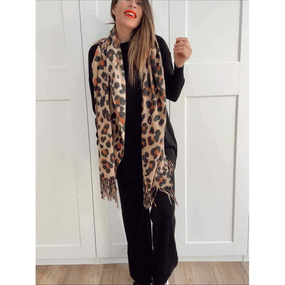 - Bufanda fina de tacto suave con estampado animal print en tonos camel, marrón y negro.