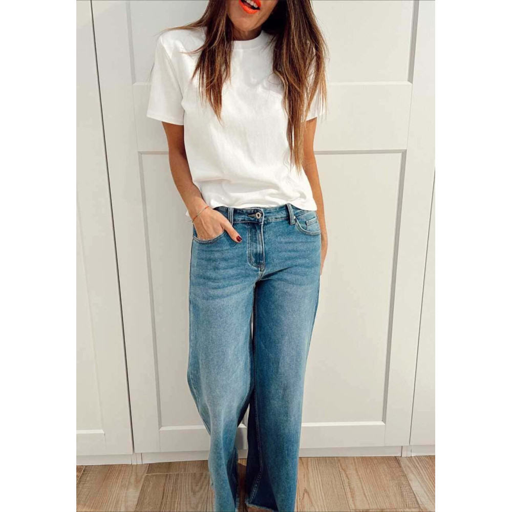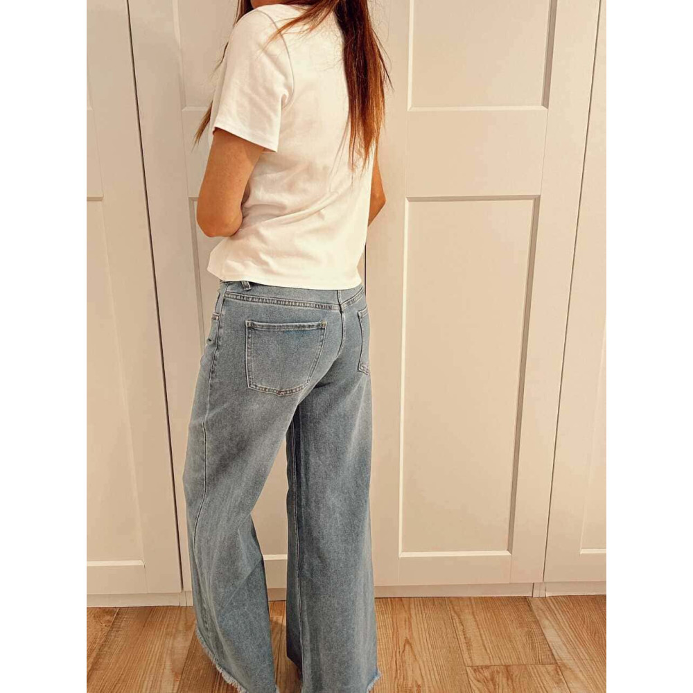 - Pantalón vaquero de tiro alto con pernera ancha y bajo desflecado.