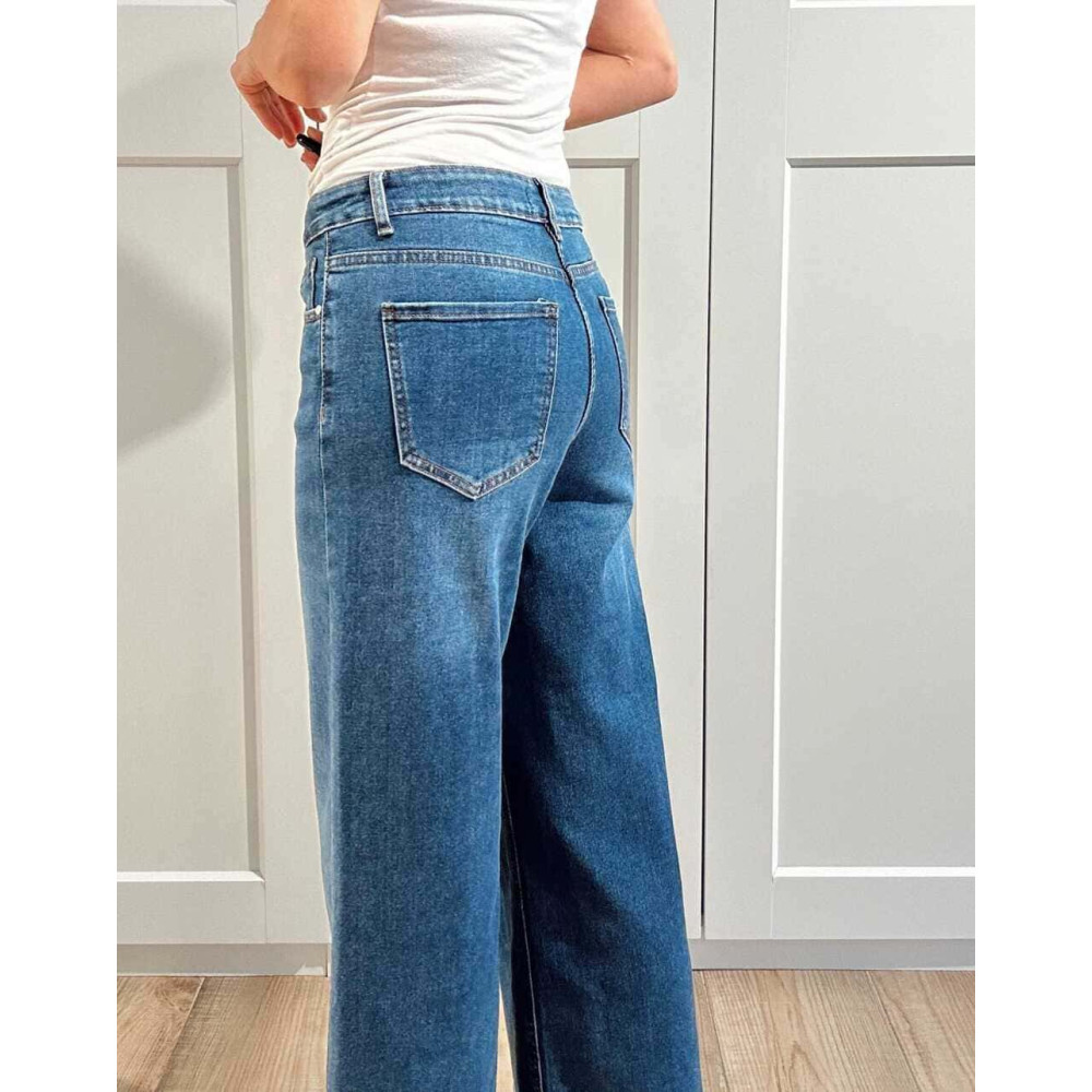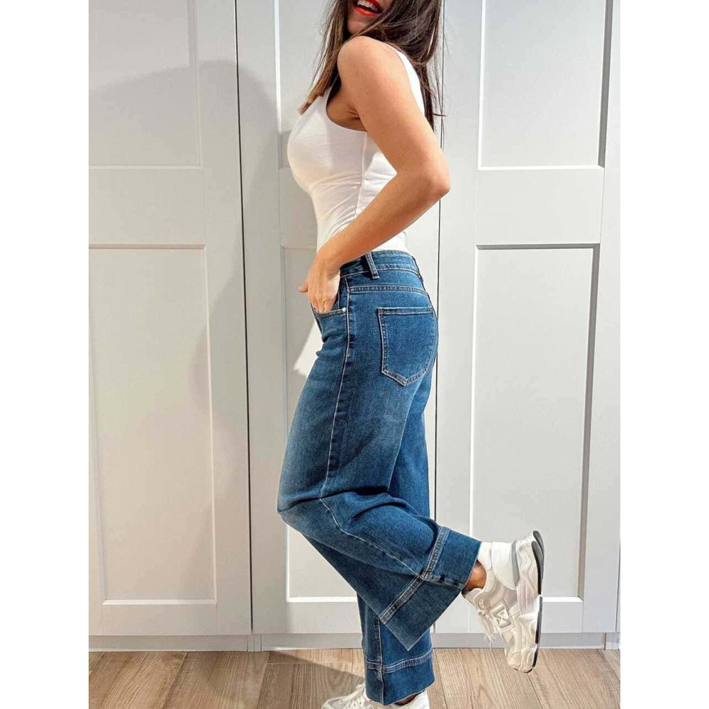 - Pantalón vaquero de mujer con pernera ancha y recta y maxi dobladillo en el bajo.