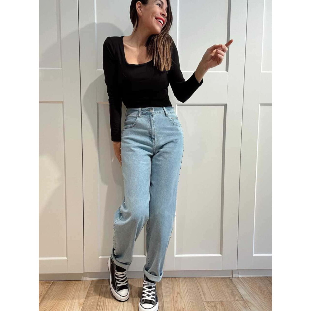 • Pantalón vaquero de tiro alto con hilera de tachas plateadas en los laterales.