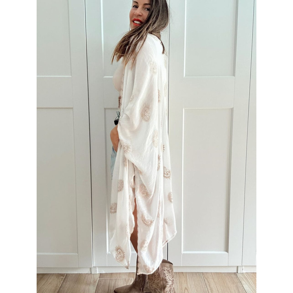 <li><strong>Kimono abierto con bordados paisley color taupe all over.</strong></li>