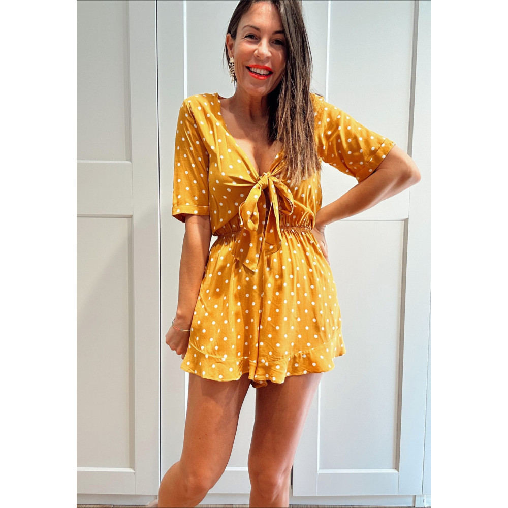 - Mono corto de mujer con estampado lunares en combinación mostaza/blanco.