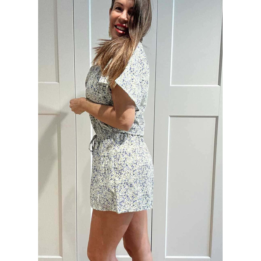 - Mono corto de mujer con estampado mini-flor en tonos morado, amarillo y verde.