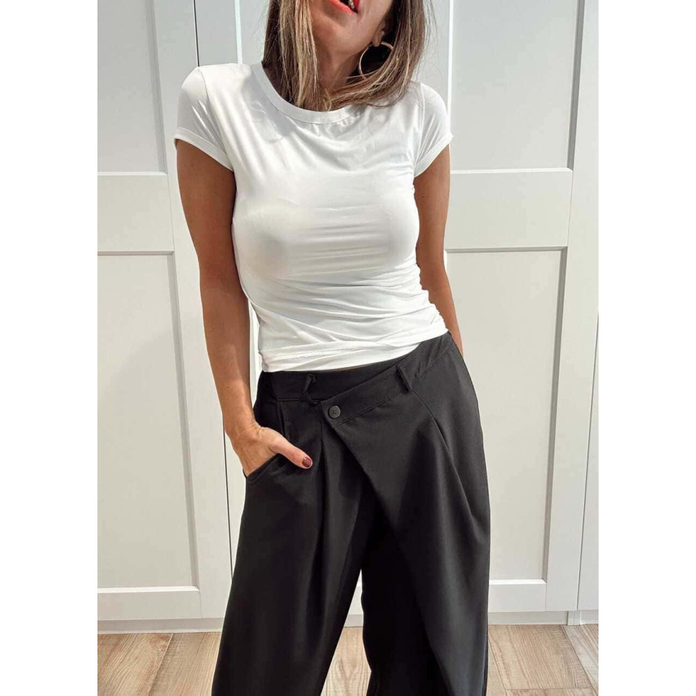 - Pantalón ancho corte balloon con efecto envolvente y diseño cruzado en delantero.